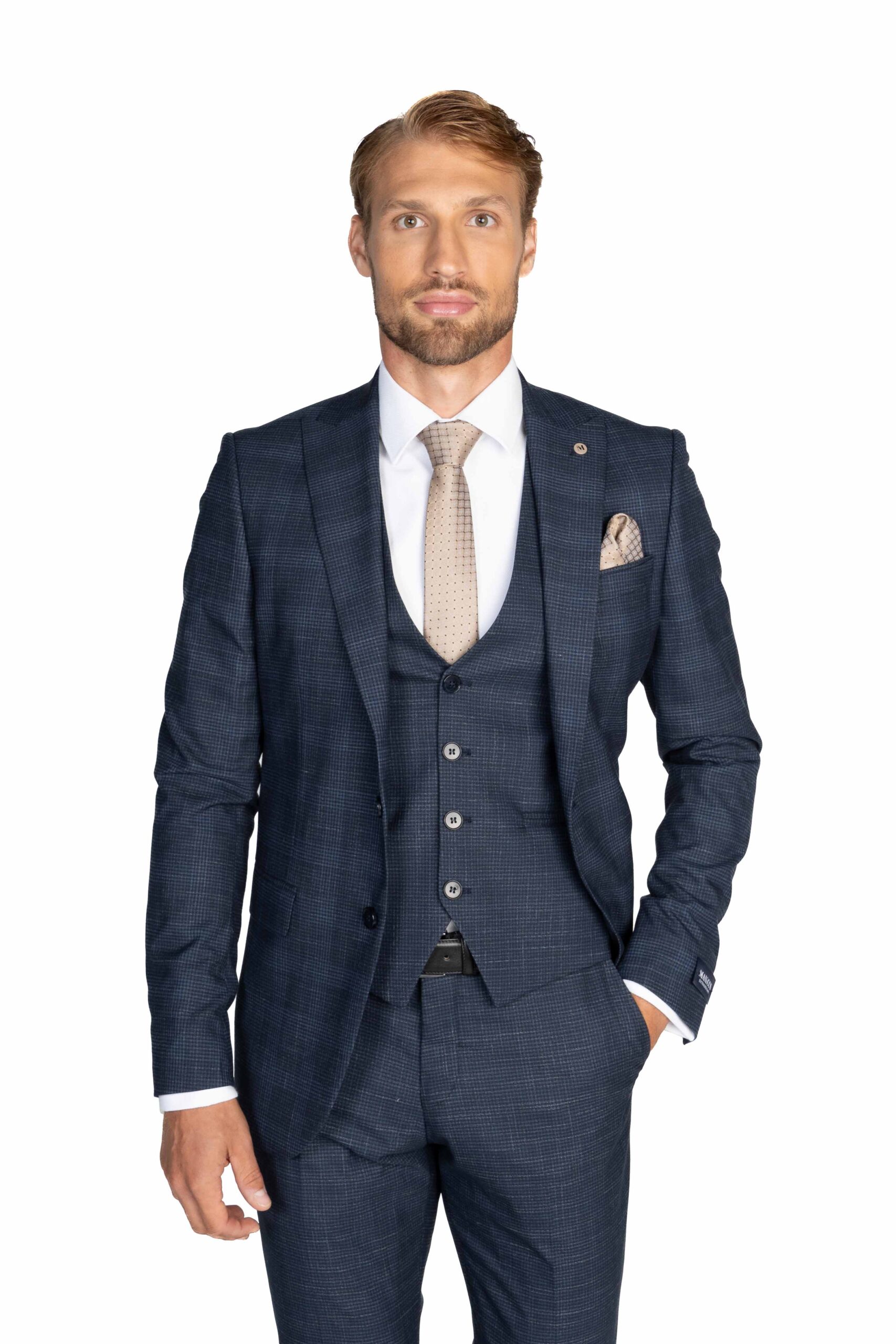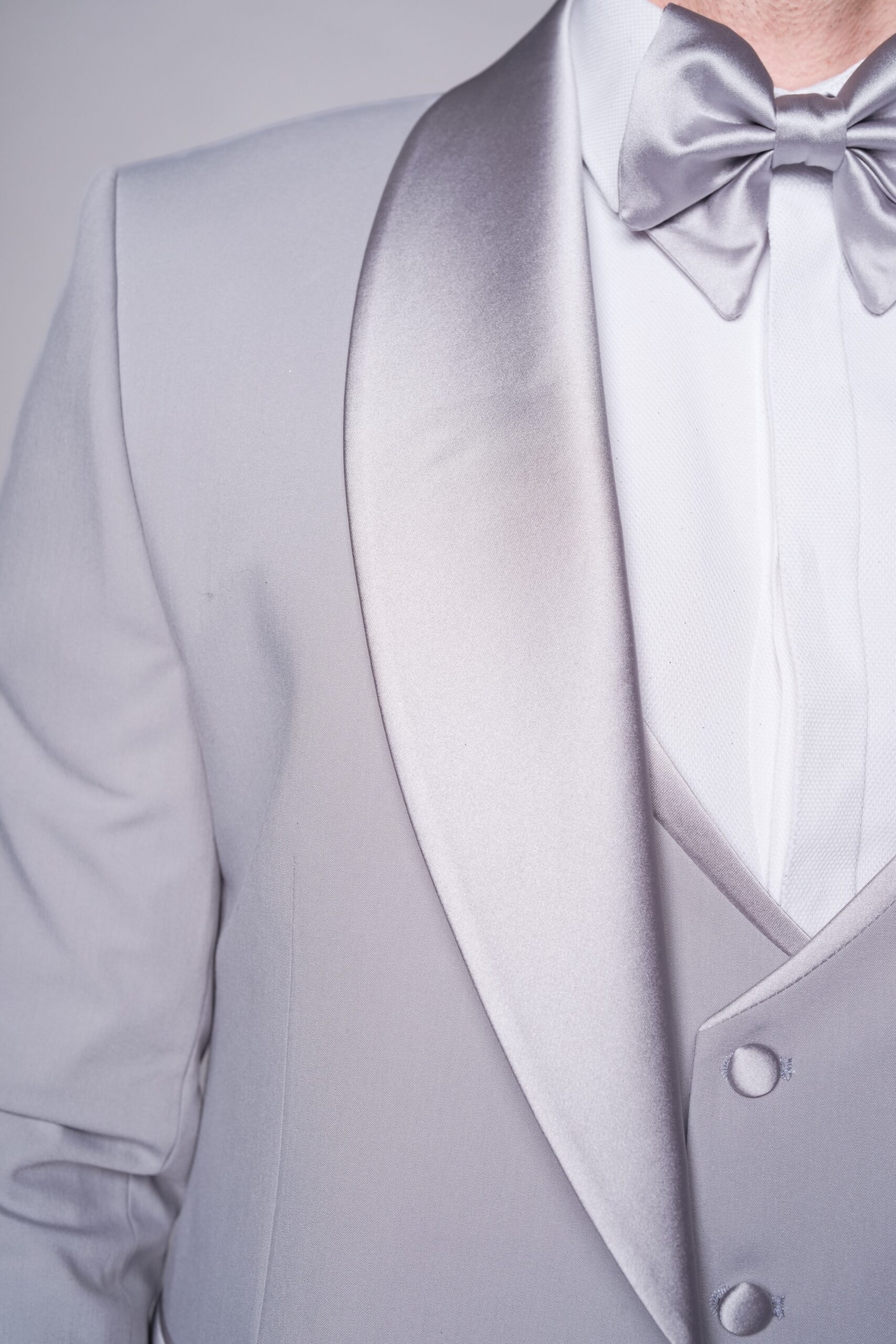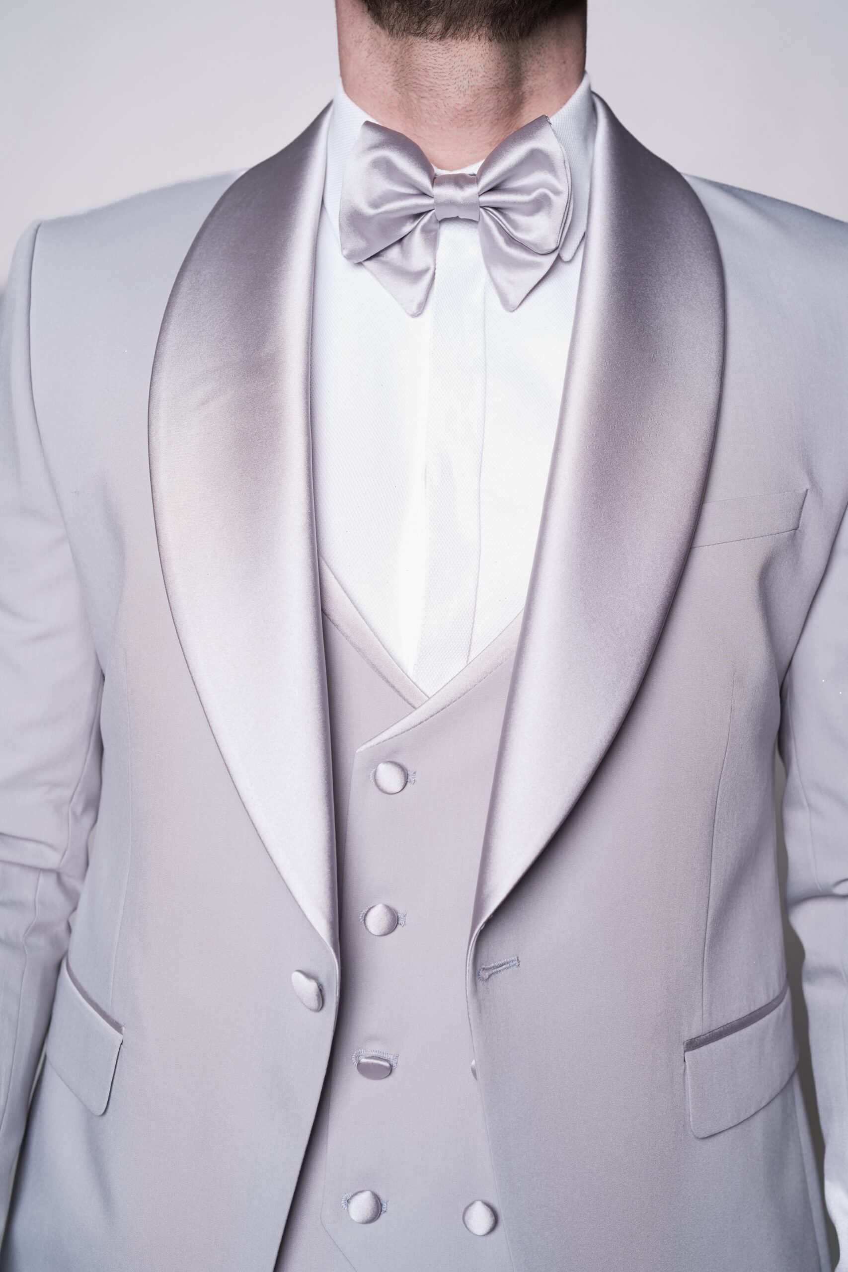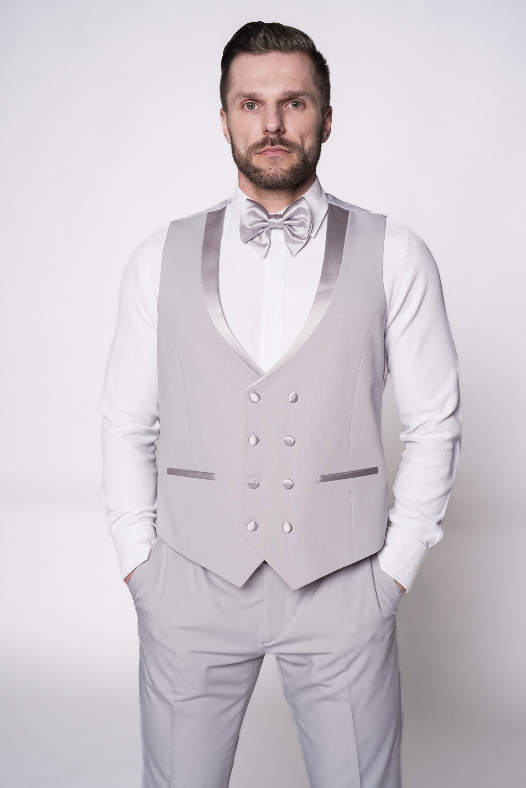 Svadobný oblek v svetlosivom tóne s jemným perleťovým efektom pôsobí sviežo a elegantne. Sako s hladkými klopami dopĺňa vesta v zladenom tóne, čo spolu vytvára uhladený a moderný vzhľad. Tento model je ideálnou voľbou pre ženícha, ktorý hľadá jemnosť, štýl a nenápadný luxus.