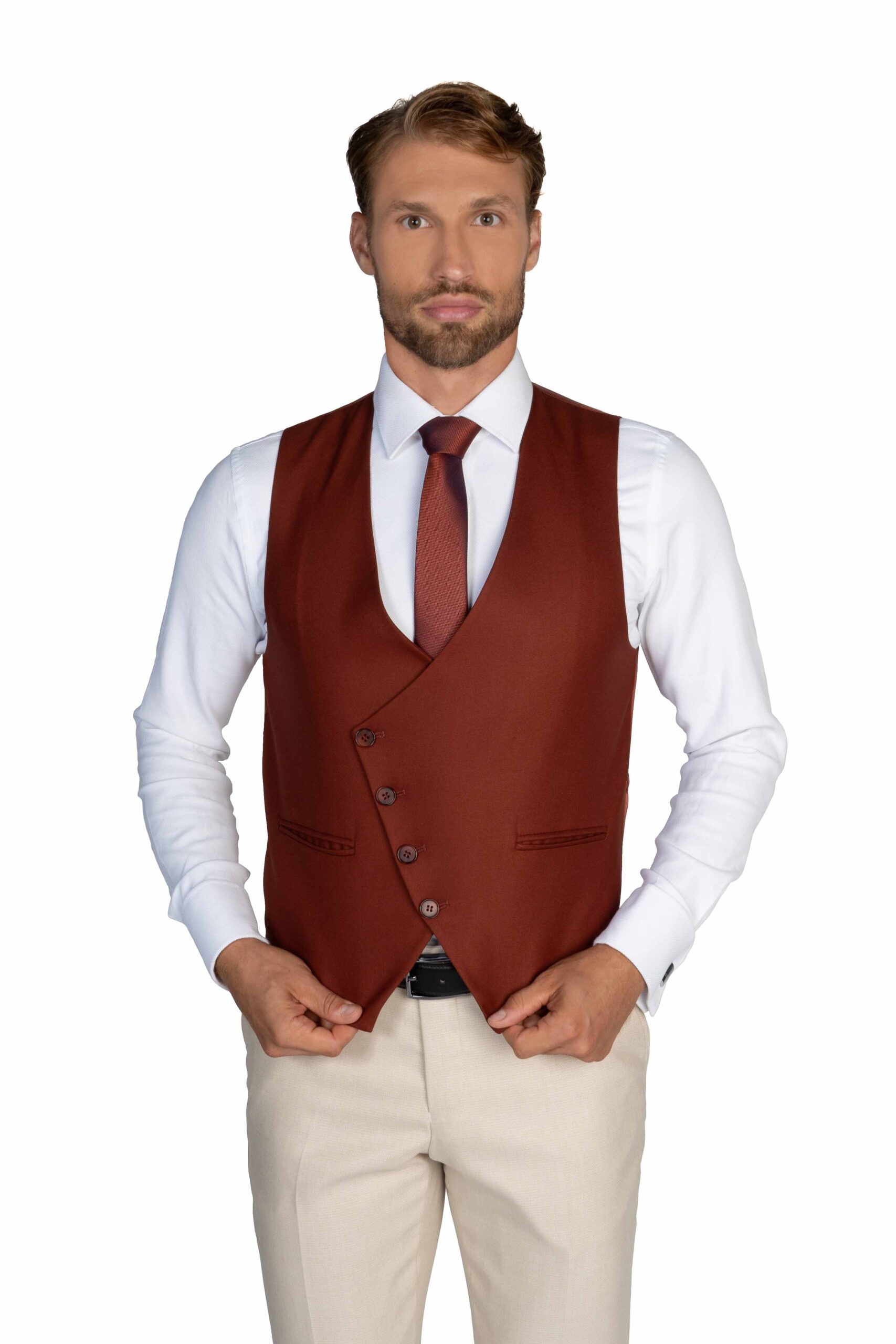 Šikmá vesta v tmavohnedej tehlovej farbe pridáva šikovný a nezvyčajný prvkový detail, ktorý ozvláštni váš celkový vzhľad. Nohavice, zhotovené z rovnakej svetlej krémovej látky ako sako, zabezpečujú harmóniu a eleganciu celého setu.