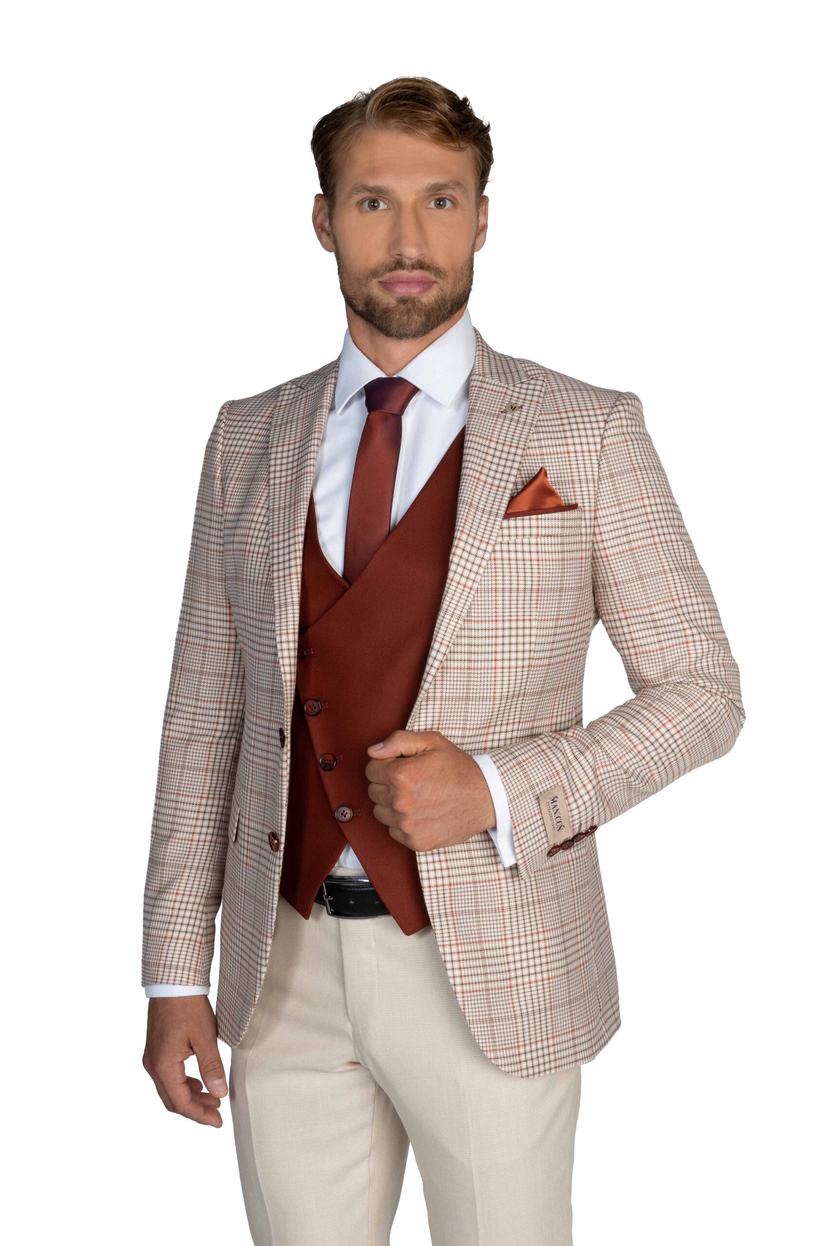Očarte svoje okolie s naším trojdielnym kremovým oblekom, ktorý je dokonalým spojením elegancie a výrazných prvkov. Sako s jeho svetlým kremovým základom a hustým tehlovým károvaním prináša sofistikovaný dojem s jemným výrazom. Tento model disponuje dvomi gombíkmi, ktoré dodávajú obleku štýlový a moderný vzhľad.
