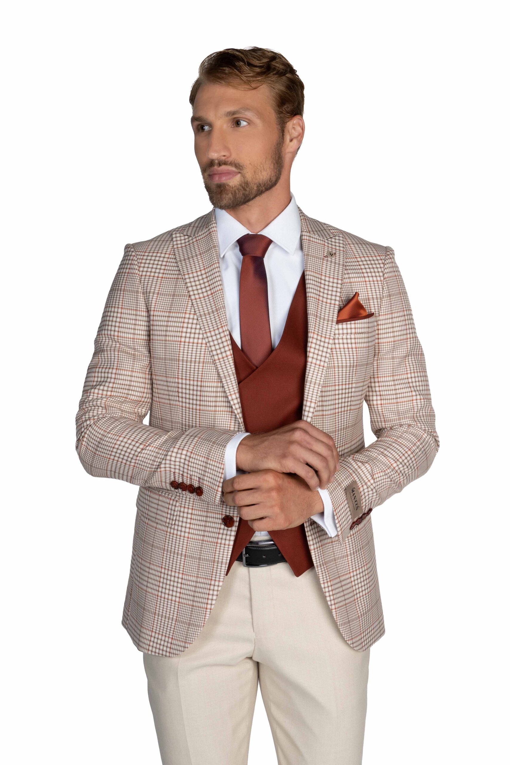 Tento krémový oblek nie je len obyčajným kúskom, ale vyjadrením vášho osobného štýlu a vkusu. Jeho svetlý tón vytvára atmosféru sviežosti a ľahkosti, zatiaľ čo tehlové károvanie dodáva obleku charakter. Celkový set obleku vytvára perfektnú rovnováhu medzi klasikou a moderným šarmom.