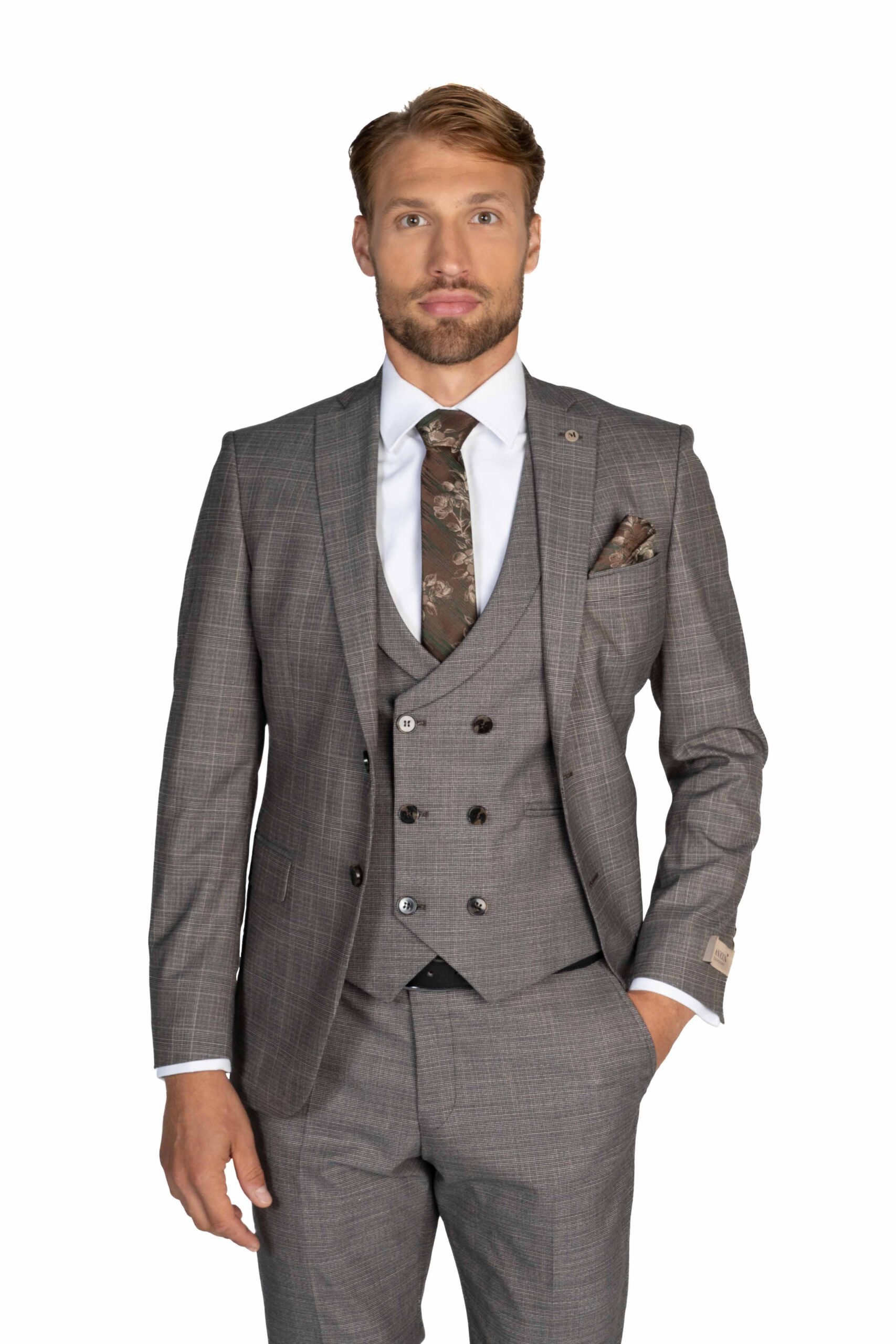 Elegantný, krémový oblek s tehlovým károvaním je skvostom vkusu a štýlu. Jeho svetlý tón predstavuje oživenie, zatiaľ čo dynamické tehlové károvanie dodáva vášmu vzhľadu originalitu. So sakom a šikmou vestou v tmavohnedej tehlovej farbe vytvoríte sofistikovaný a štýlový dojem. Kráčajte do otvorených dverí spoločenských udalostí so sebavedomím a šarmom v tomto svetlom kúsku, ktorý spája klasiku s moderným vkusom.
