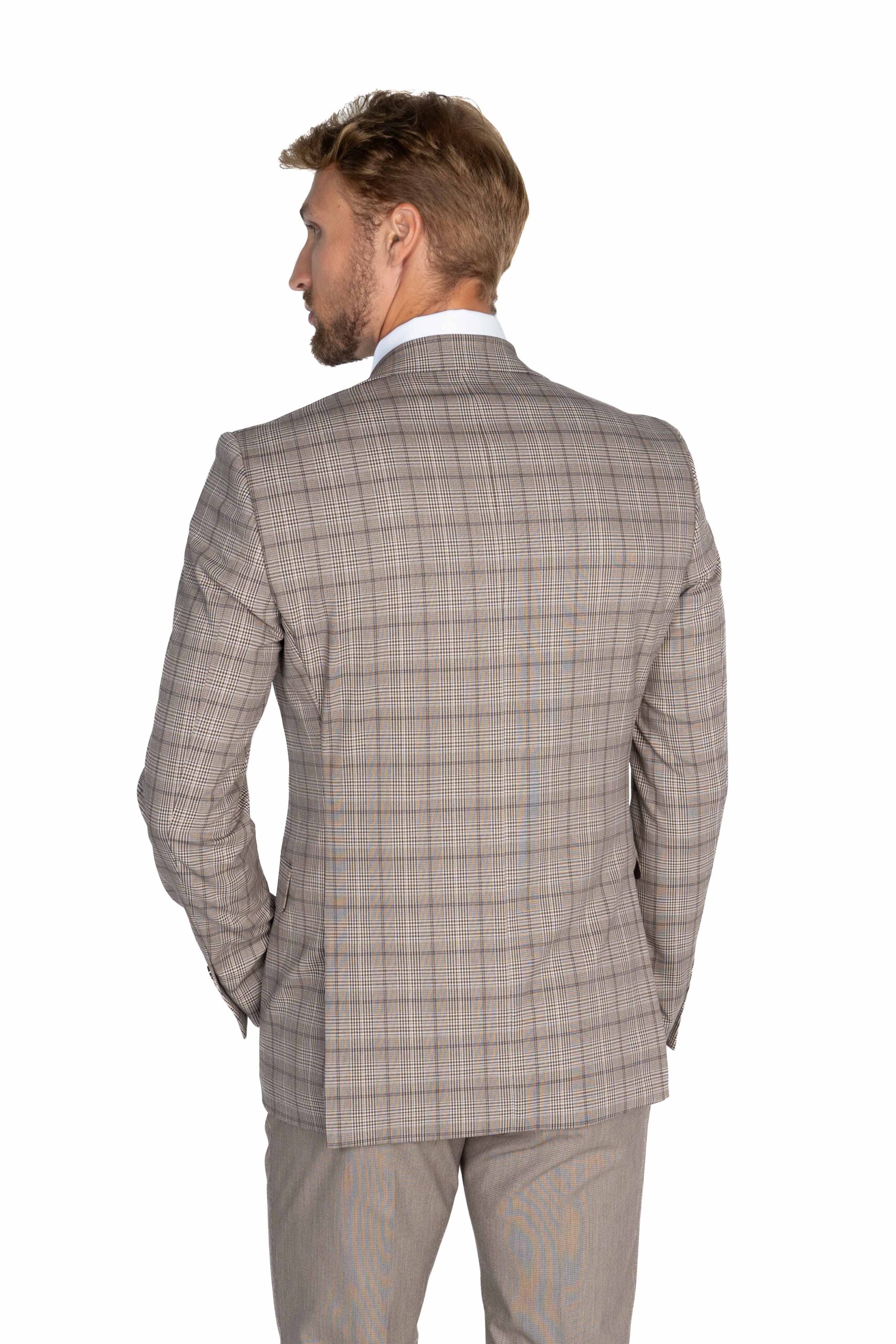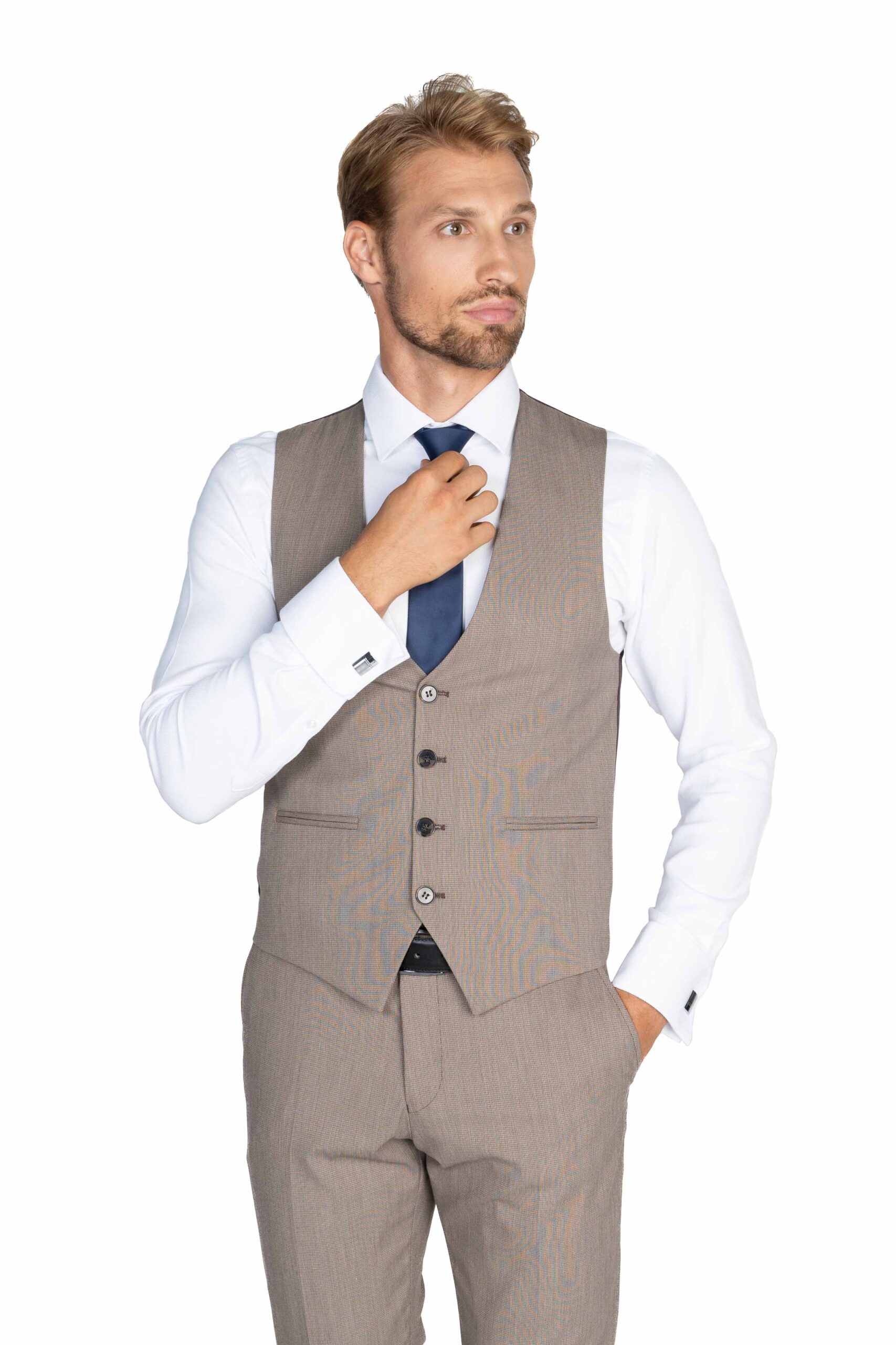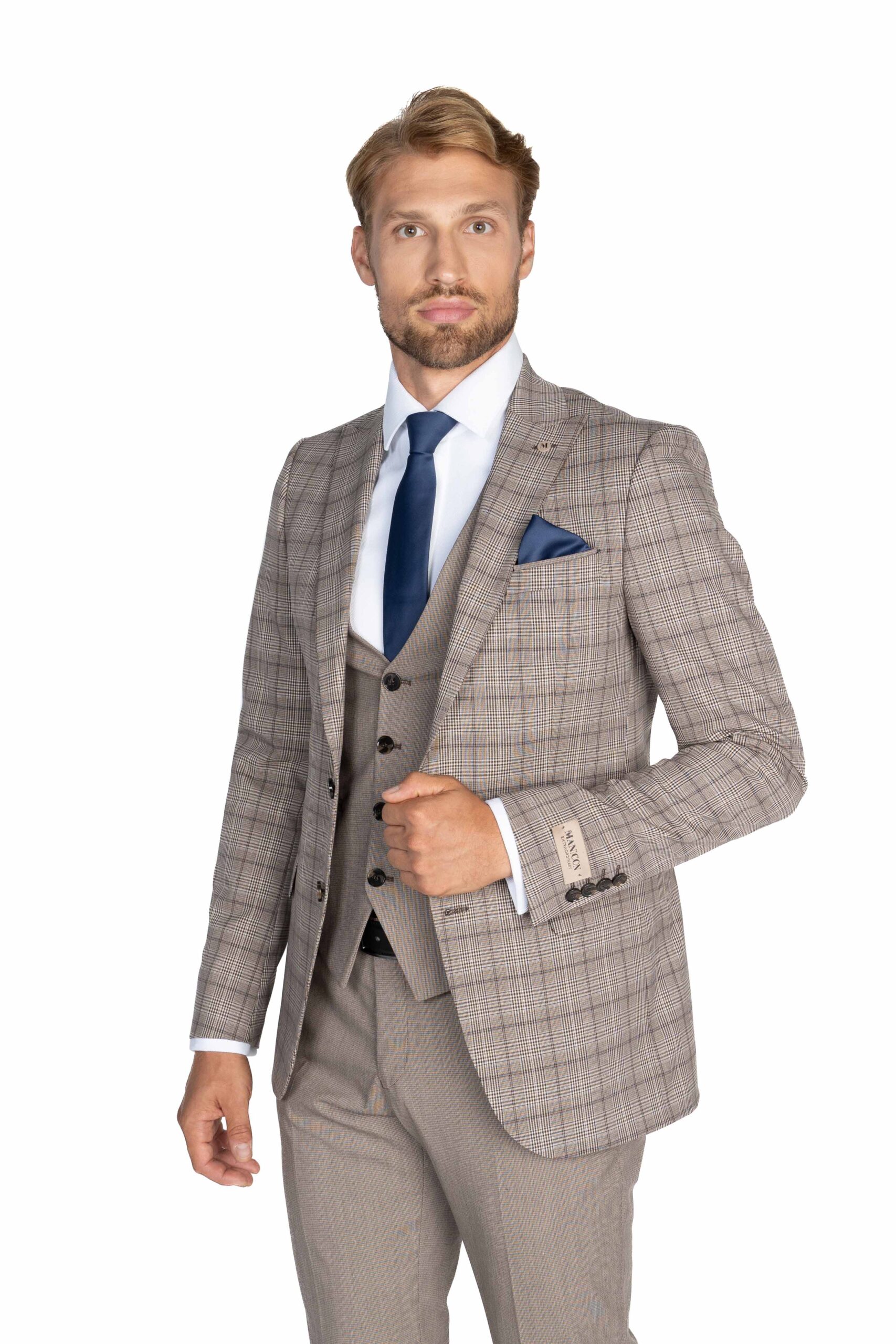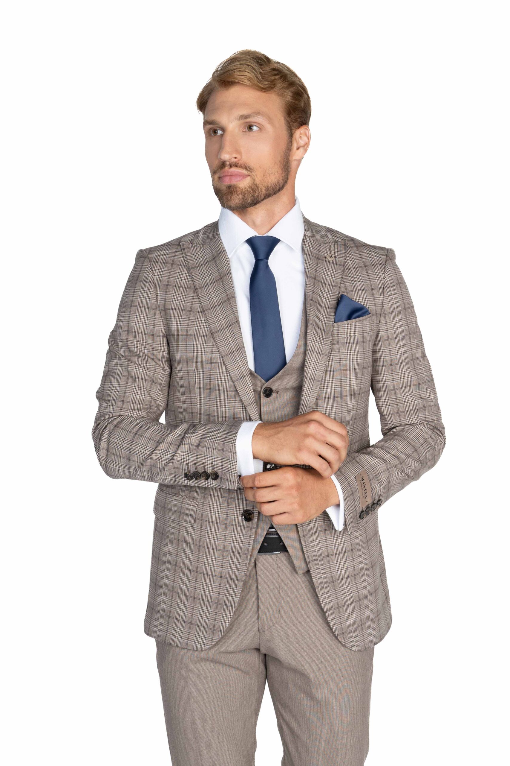 Svetlý károvaný oblek hnedej farby s krémovou kockou očarí svojou rafinovanosťou. Odtieň vesty a nohavíc v neutrálnej zemitej farbe dodáva klasický nádych.
