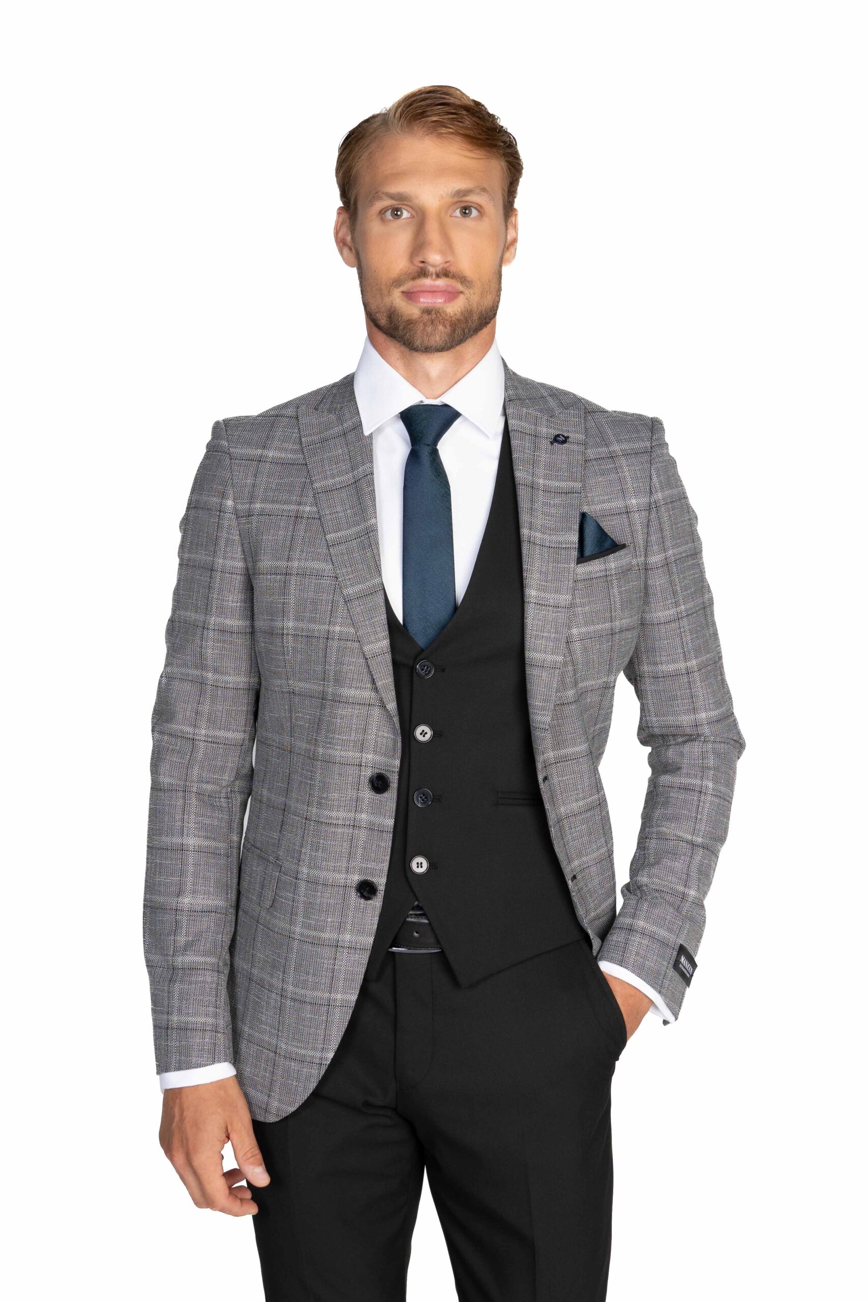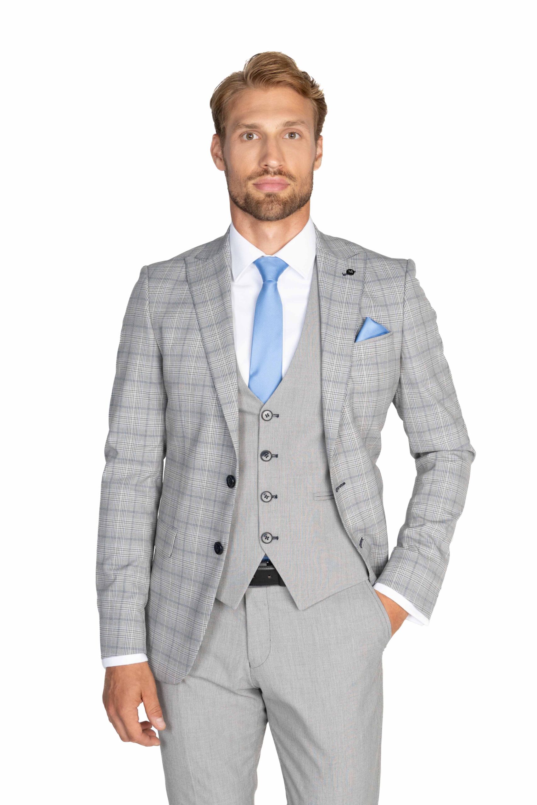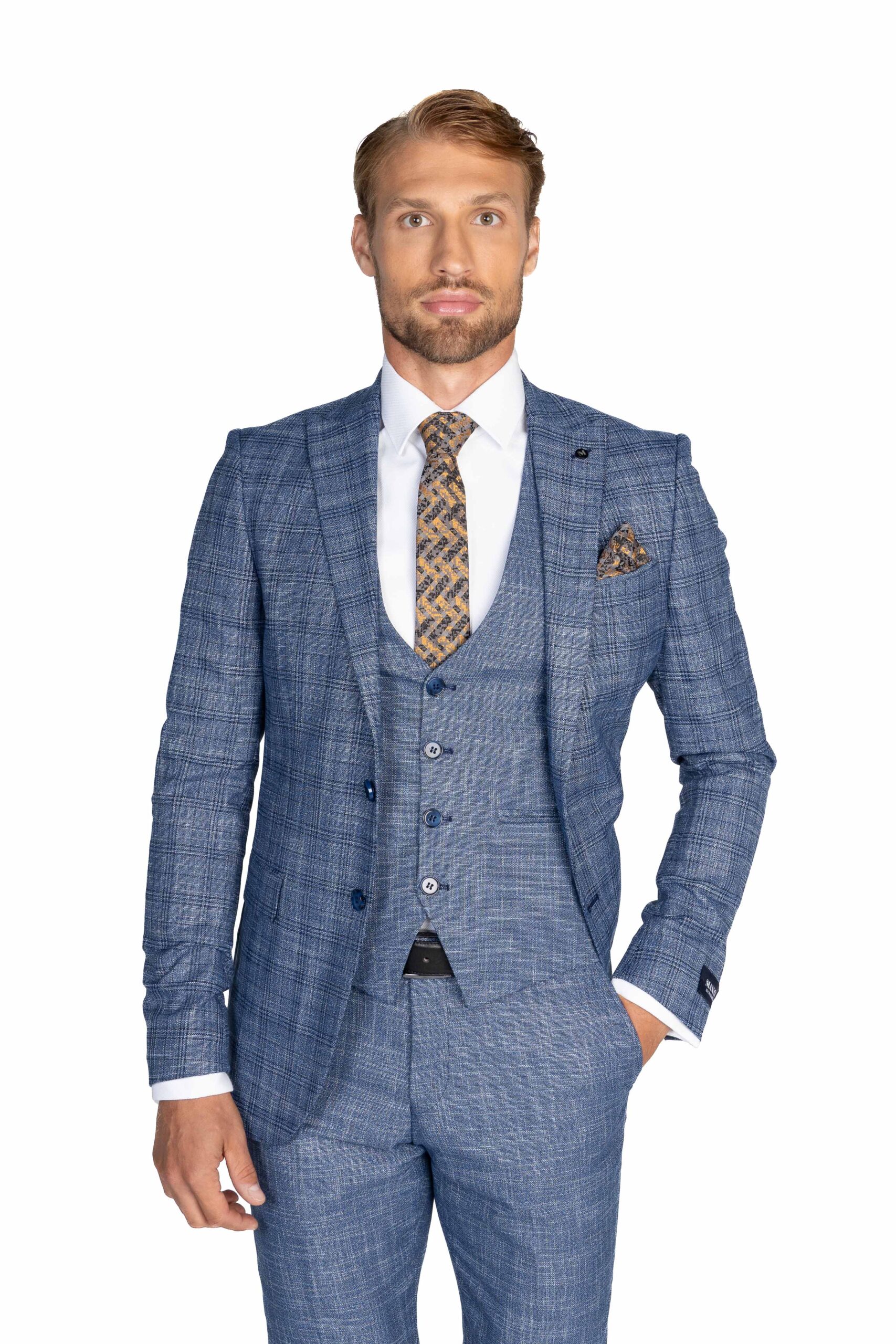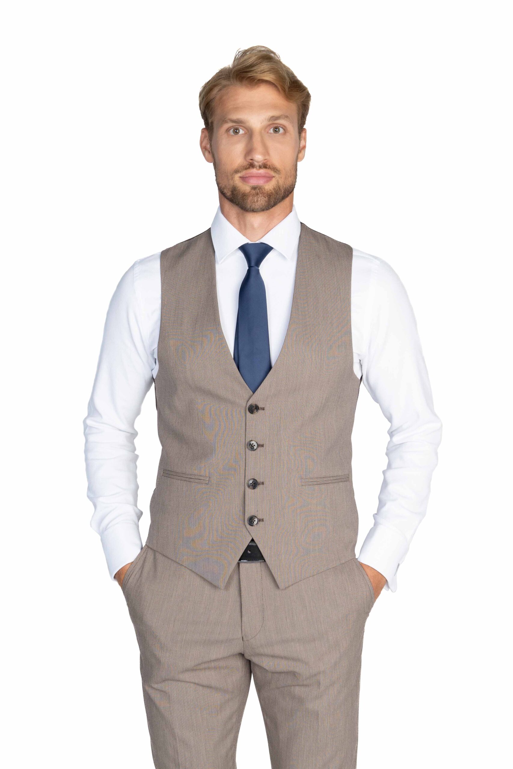 Svetlý károvaný oblek hnedej farby s krémovou kockou očarí svojou rafinovanosťou. Odtieň vesty a nohavíc v neutrálnej zemitej farbe dodáva klasický nádych.