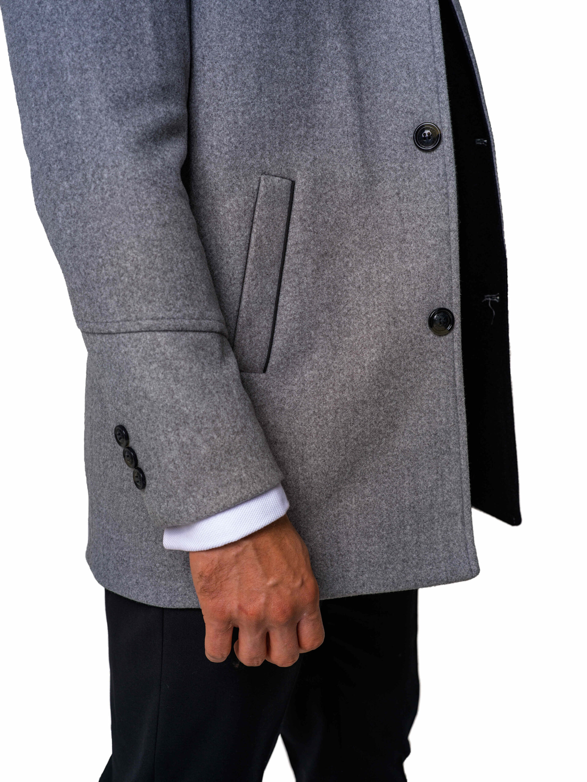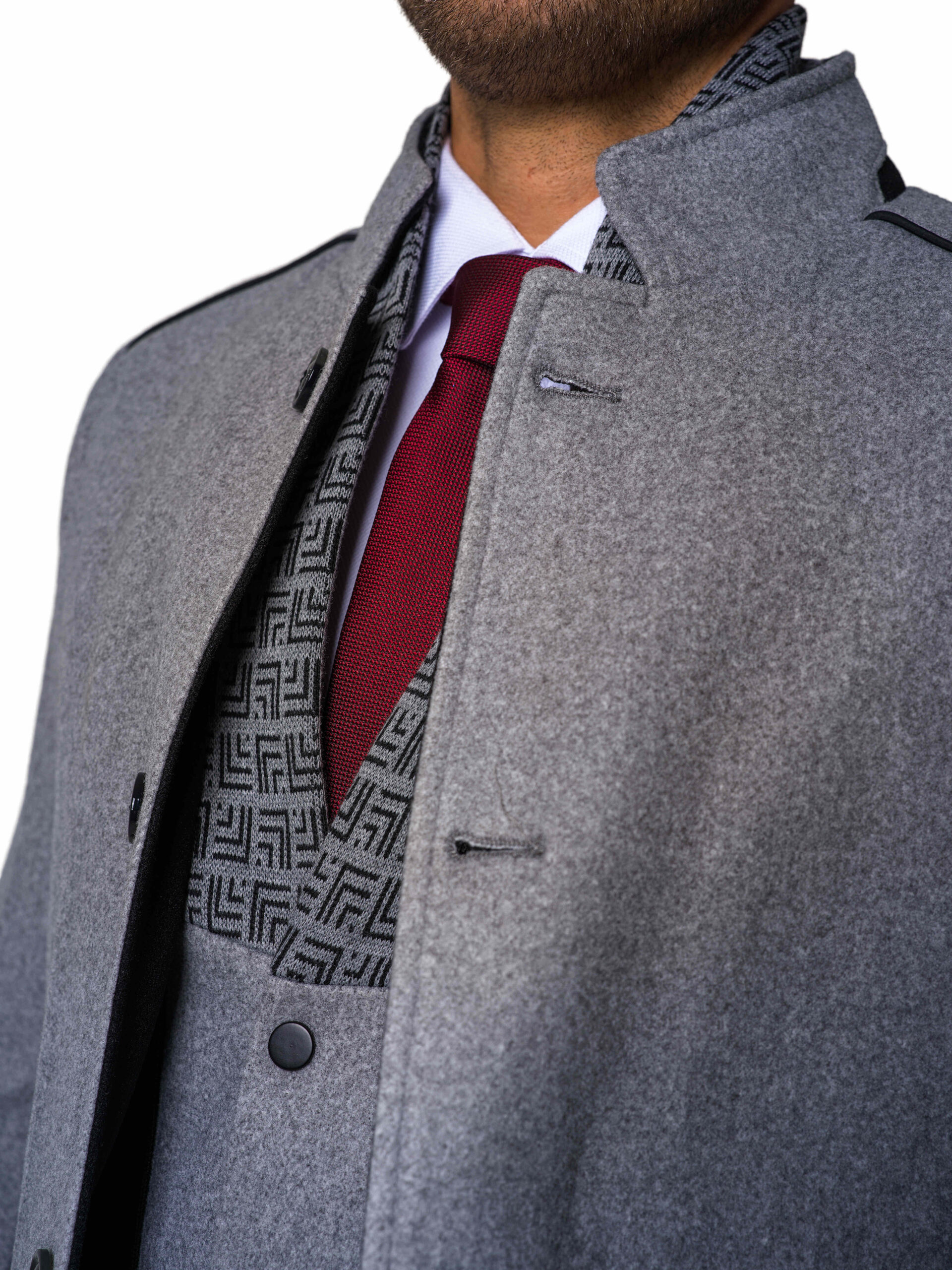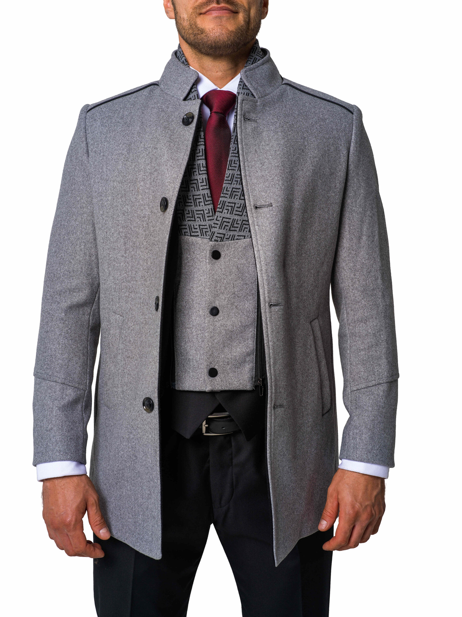 Jednoradový kabát v sofistikovanom sivom odtieni so stojacim golierom a čiernymi akcentmi spája moderný dizajn s nadčasovou eleganciou. Decentná podšívka s jemným vzorom dodáva modelu osobitý charakter a štýl vhodný pre každú príležitosť.