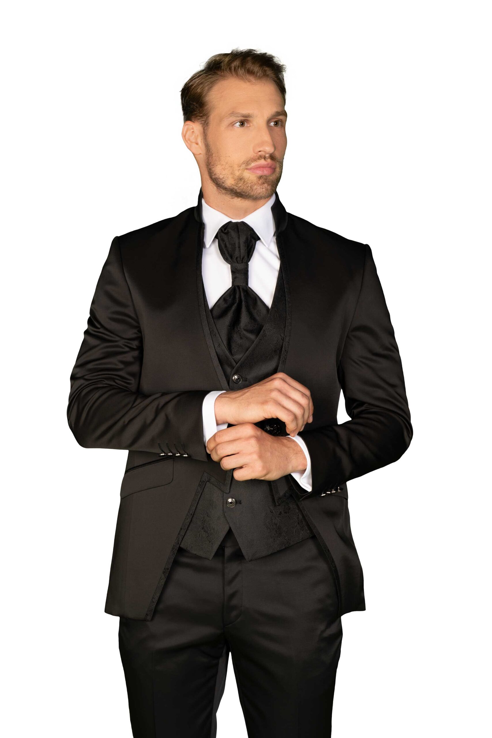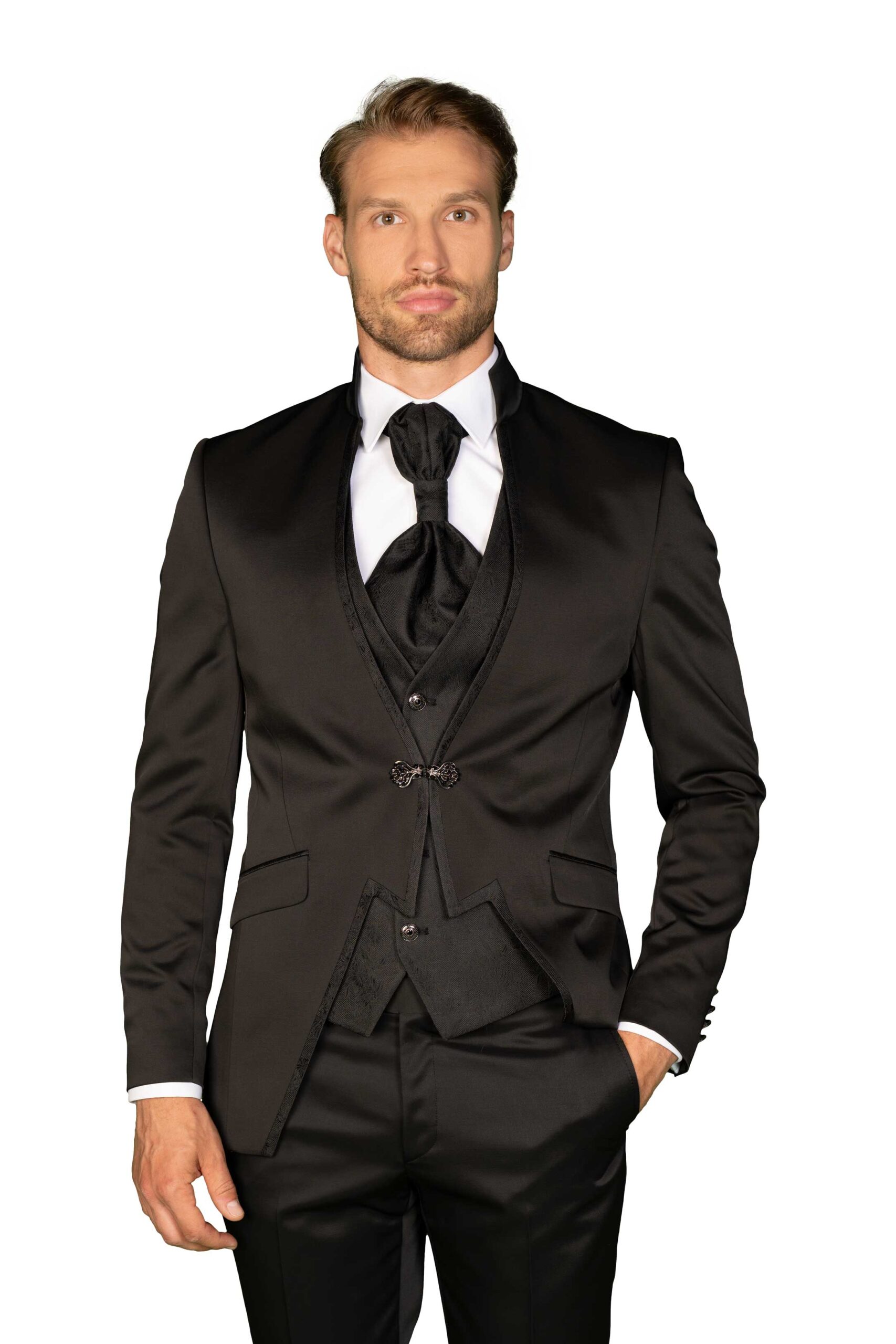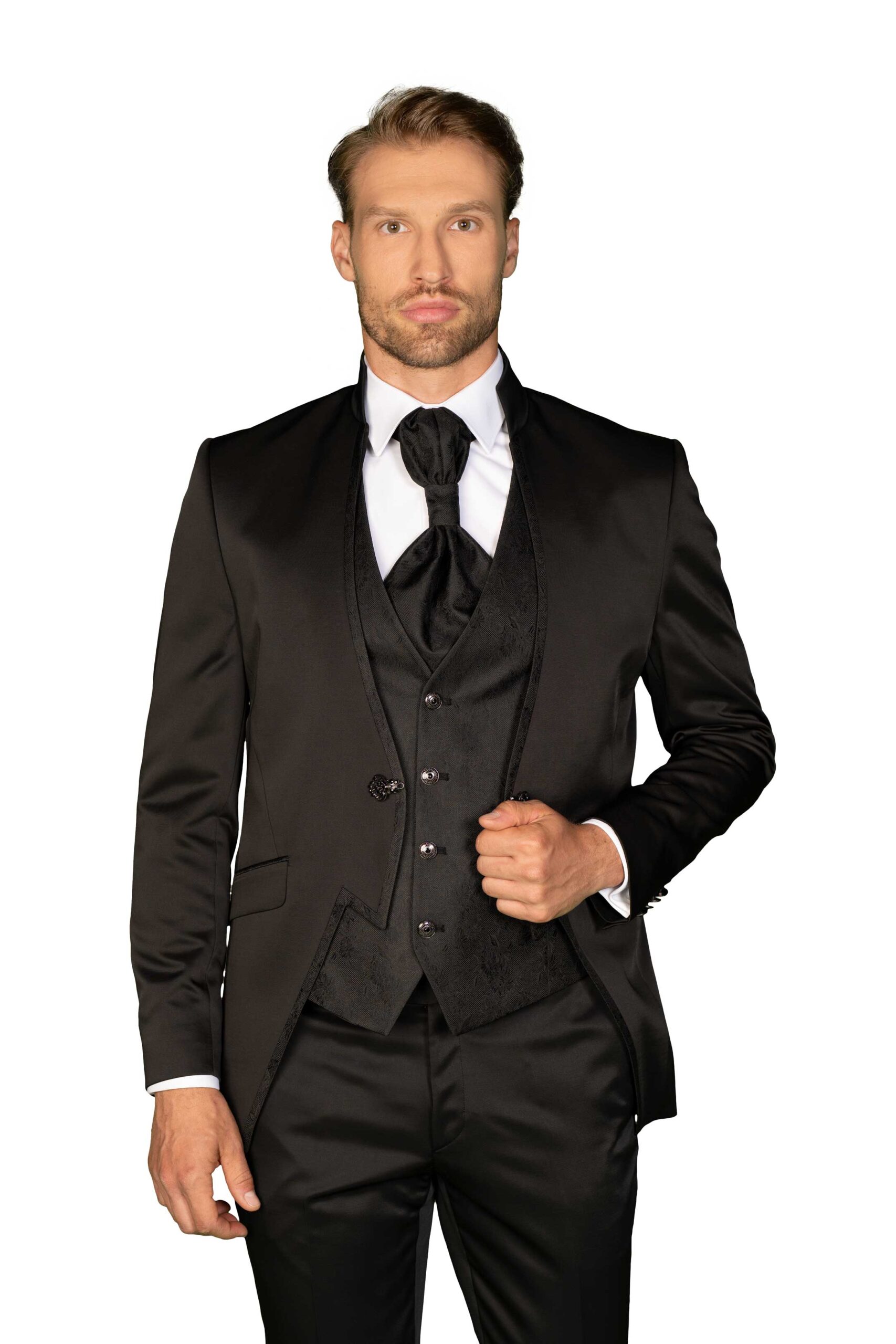 Tento čierny svadobný oblek v barokovom štýle v sebe spája elegantnú vznešenosť. Sako a nohavice sú vyrobené z hladkej látky s jemným lesklým podtónom, čo mu dodáva sofistikovaný vzhľad. Obvod saka dopĺňa tenký lem rovnakej látky, z ktorej je ušitá vesta a kravata, čo môžeme nazvať nezabudnuteľným prvkom, ktorý zvyšuje pozornosť k detailom a kvalitu. Vesta je detailne zdobená jemným vzorom, ktorý pridáva obleku nezameniteľný štýlový nádych.Tento havraní čierny oblek je ideálnou voľbou pre muža, ktorý túži po spojení nezameniteľného s moderným štýlom, a predstavuje dokonalú voľbu na jeho veľký deň.