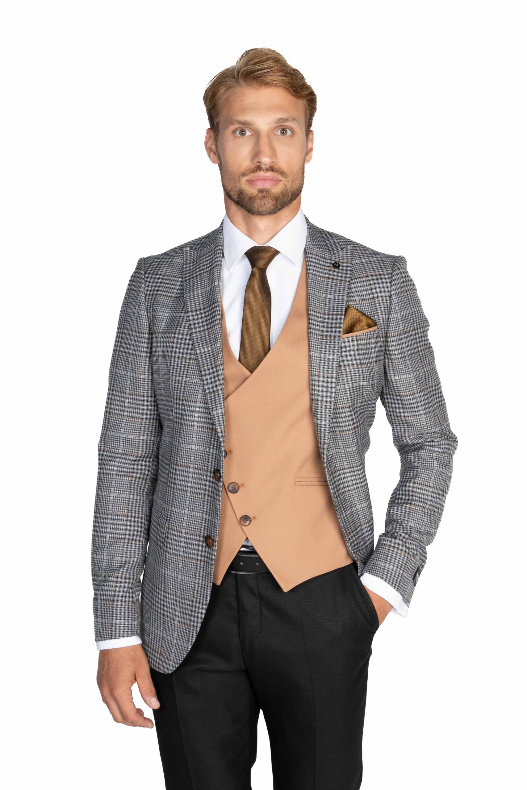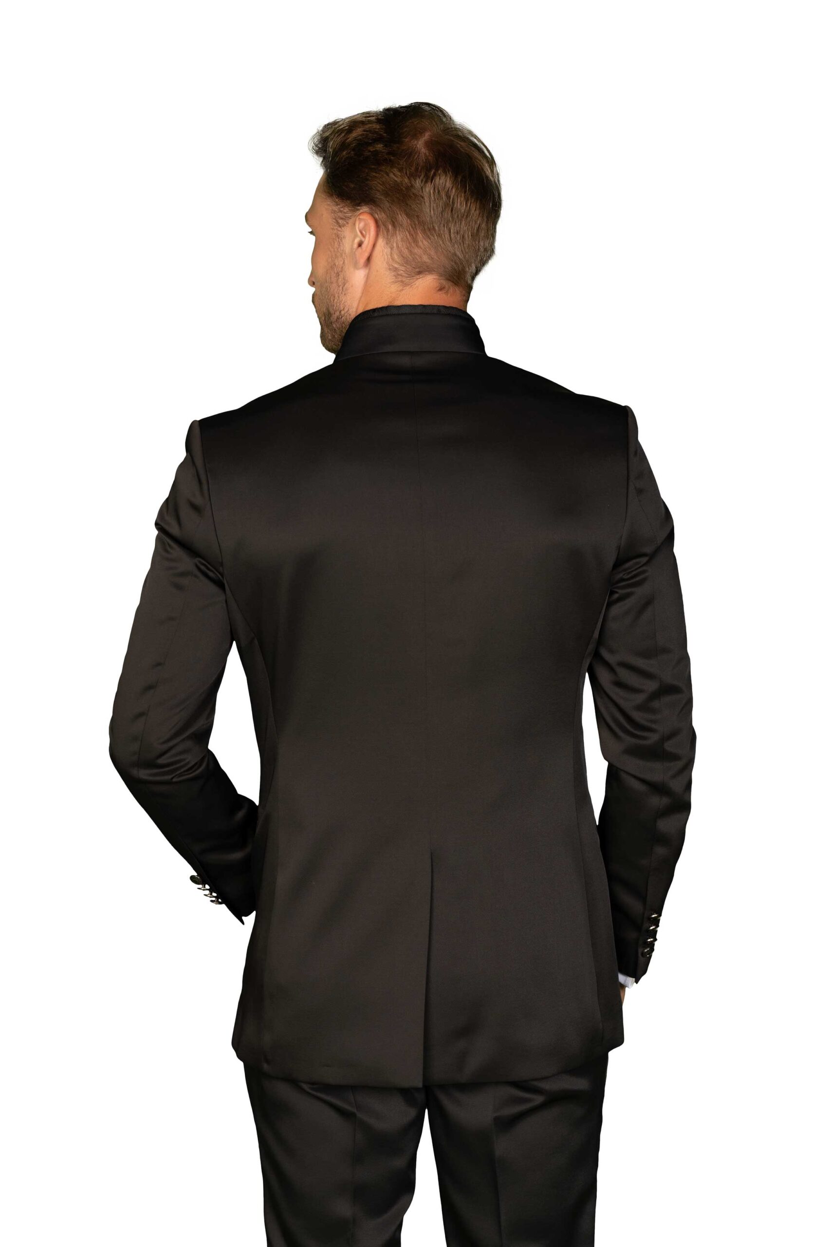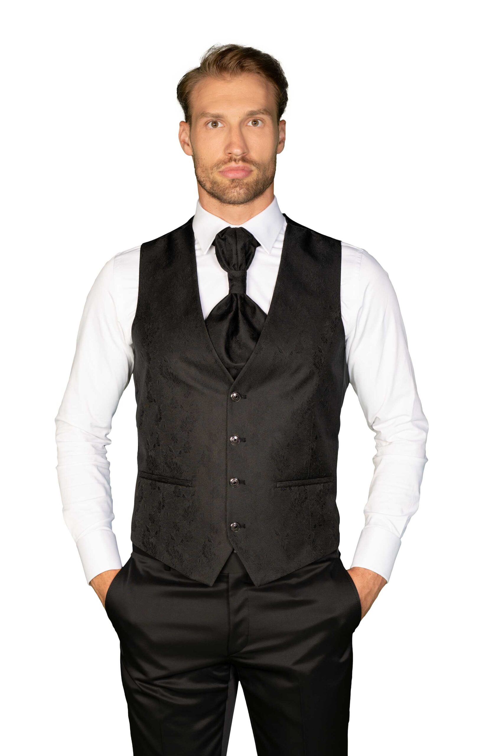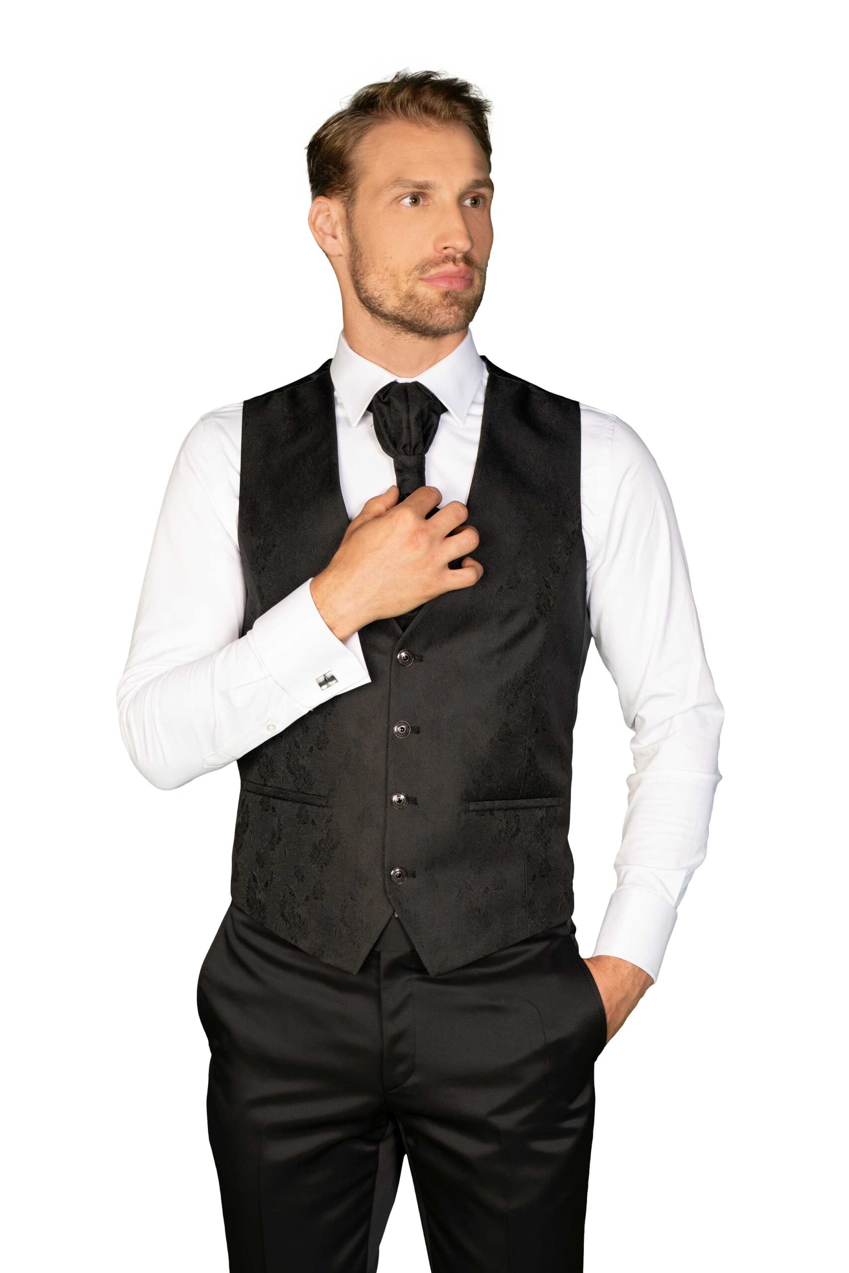 Tento čierny svadobný oblek v barokovom štýle v sebe spája elegantnú vznešenosť. Sako a nohavice sú vyrobené z hladkej látky s jemným lesklým podtónom, čo mu dodáva sofistikovaný vzhľad. Obvod saka dopĺňa tenký lem rovnakej látky, z ktorej je ušitá vesta a kravata, čo môžeme nazvať nezabudnuteľným prvkom, ktorý zvyšuje pozornosť k detailom a kvalitu. Vesta je detailne zdobená jemným vzorom, ktorý pridáva obleku nezameniteľný štýlový nádych.Tento havraní čierny oblek je ideálnou voľbou pre muža, ktorý túži po spojení nezameniteľného s moderným štýlom, a predstavuje dokonalú voľbu na jeho veľký deň.
