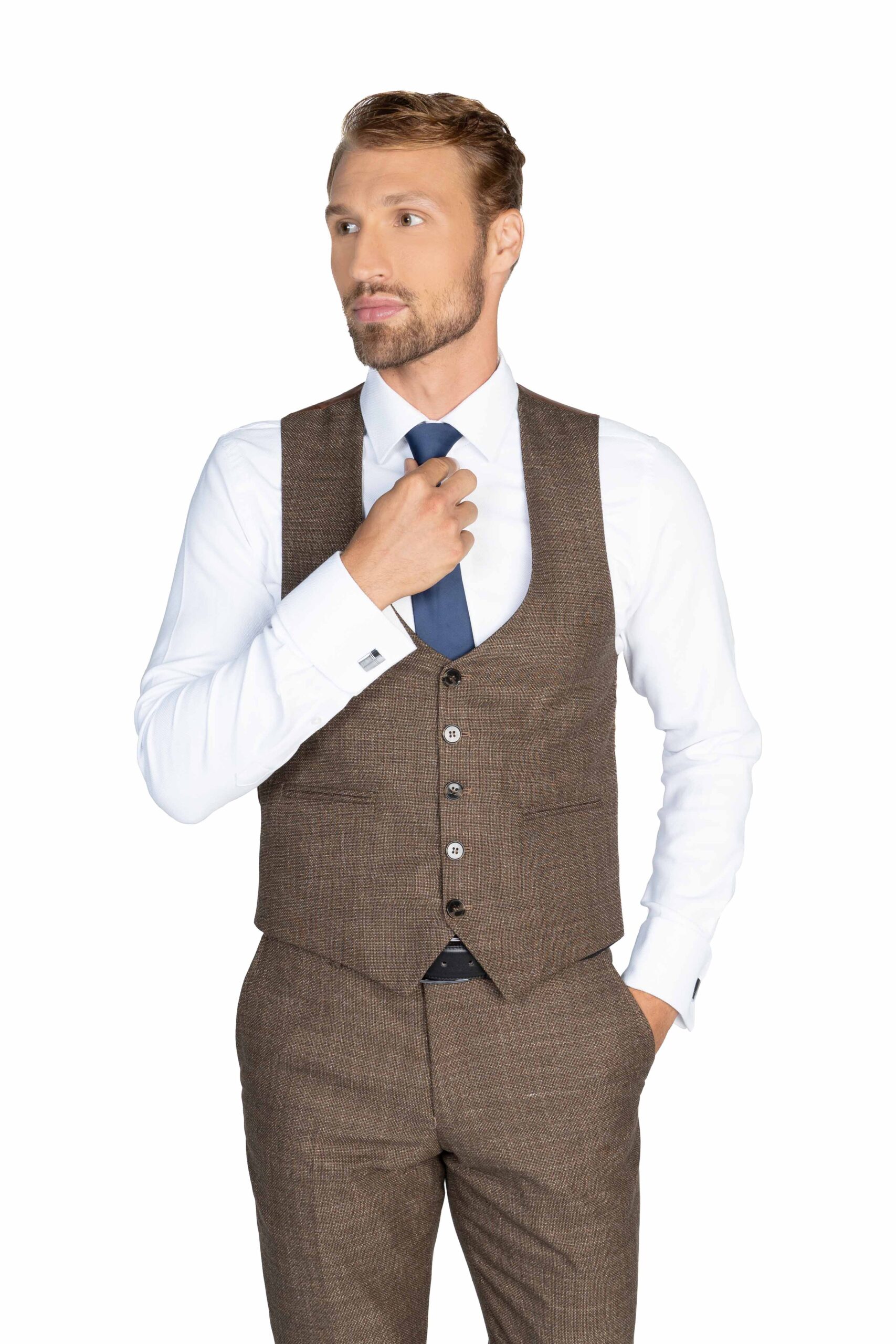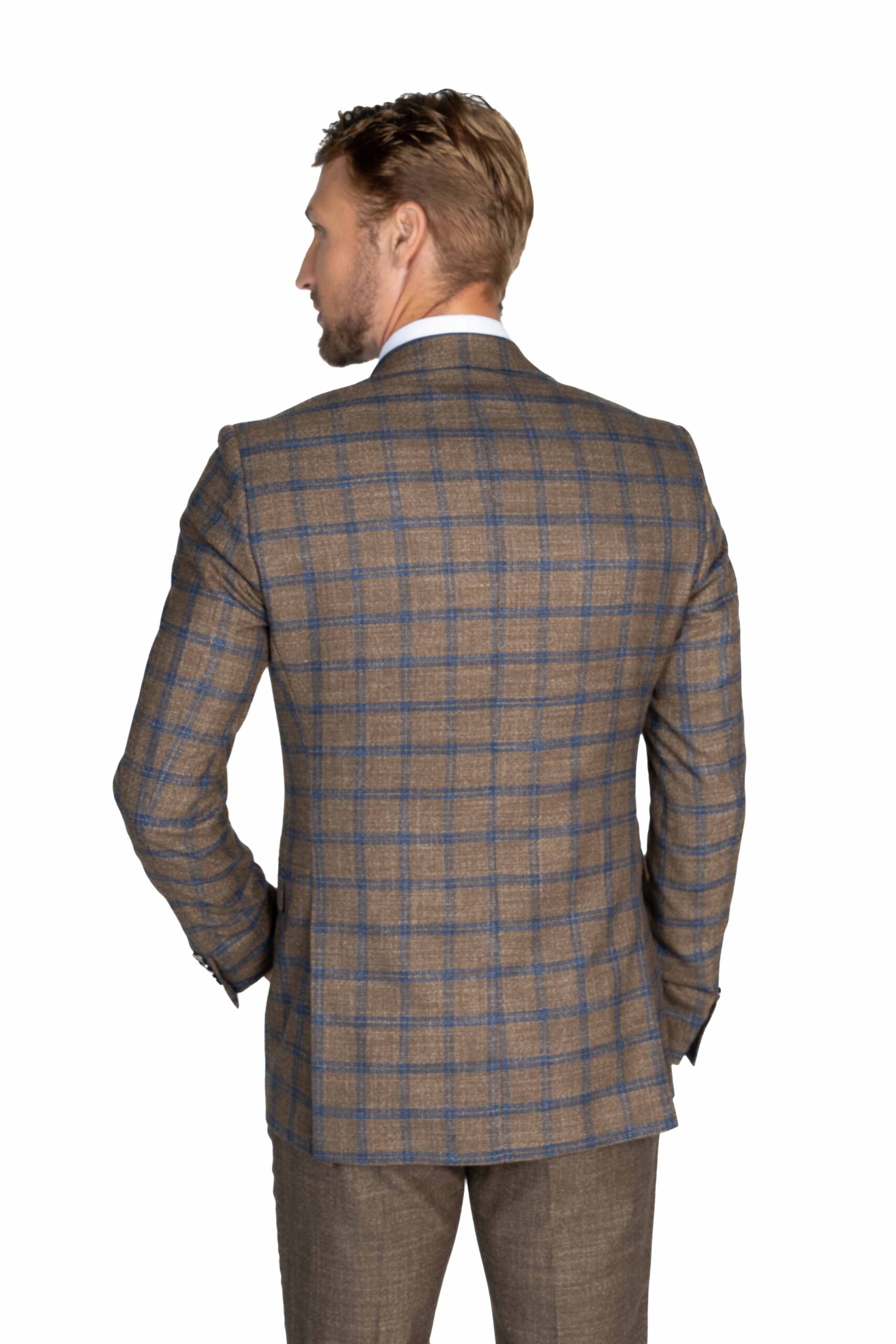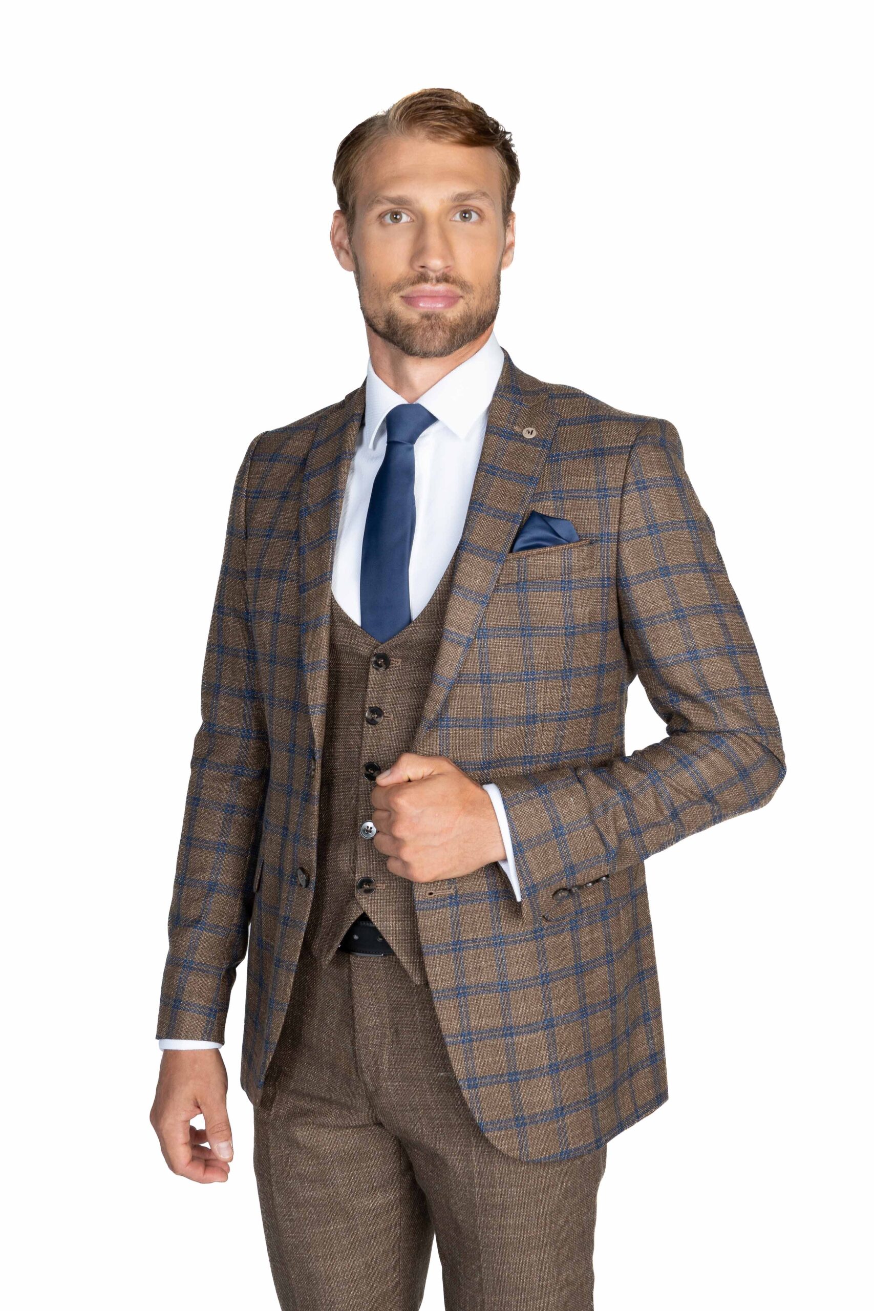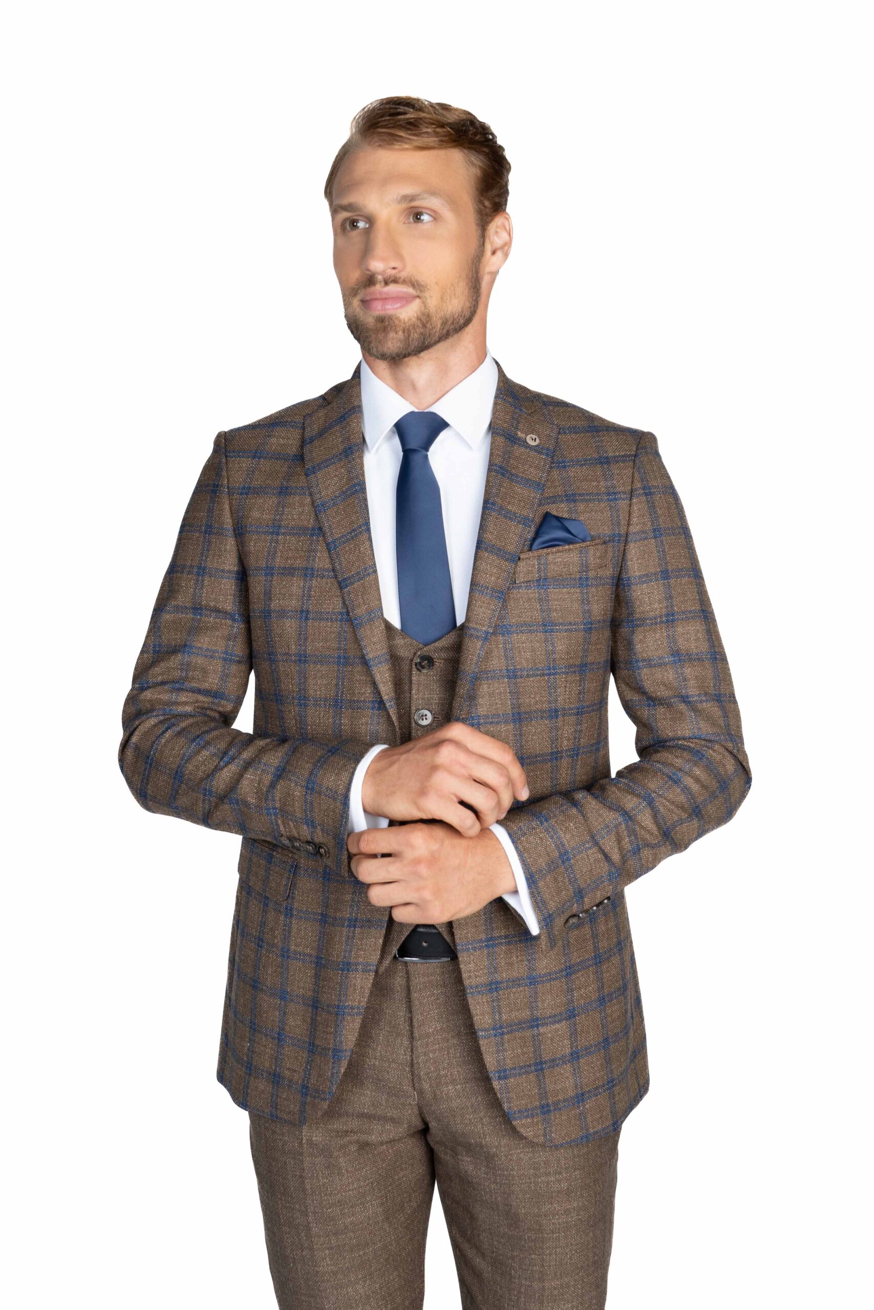 Výrazný hnedý oblek s tmavomodrou kockou vzbudzuje dojem modernej klasiky. Vesta a nohavice rovnakej štrukturovanej hnedej látky z neho vytvárajú sebavedomú voľbu.