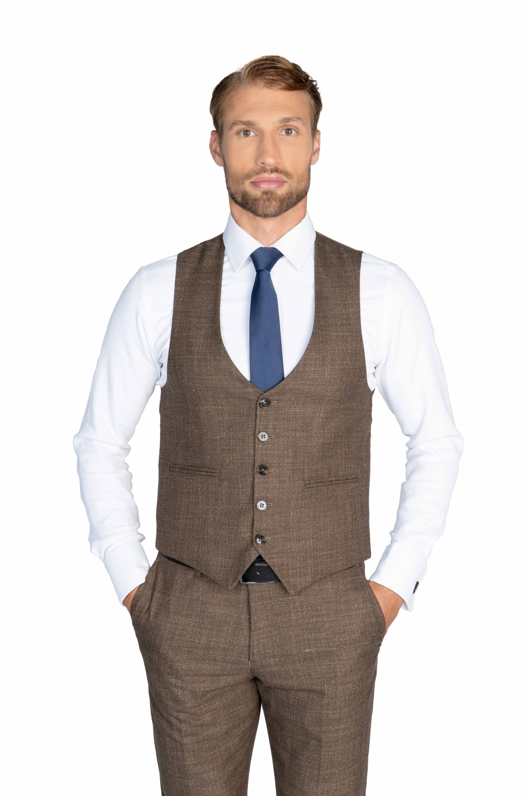Výrazný hnedý oblek s tmavomodrou kockou vzbudzuje dojem modernej klasiky. Vesta a nohavice rovnakej štrukturovanej hnedej látky z neho vytvárajú sebavedomú voľbu. Tento hnedý oblek s tmavomodrou kockou je značkou moderného klasického štýlu. Jeho výrazný dizajn kombinuje tradičné prvky s aktuálnymi trendmi, čo vytvára dojem elegantnej originality. Hnedá vesta a nohavice s rovnakou štruktúrou pridávajú obleku sebavedomý a vkusný charakter. Tento kombinovaný outfit je prejavom elegancie s nádychom odvahy a šikovnosti. Je to voľba pre mužov, ktorí si radi obliekajú obleky, ktoré neboja vybočiť z radu a vyjadrujú svoju osobnosť.
