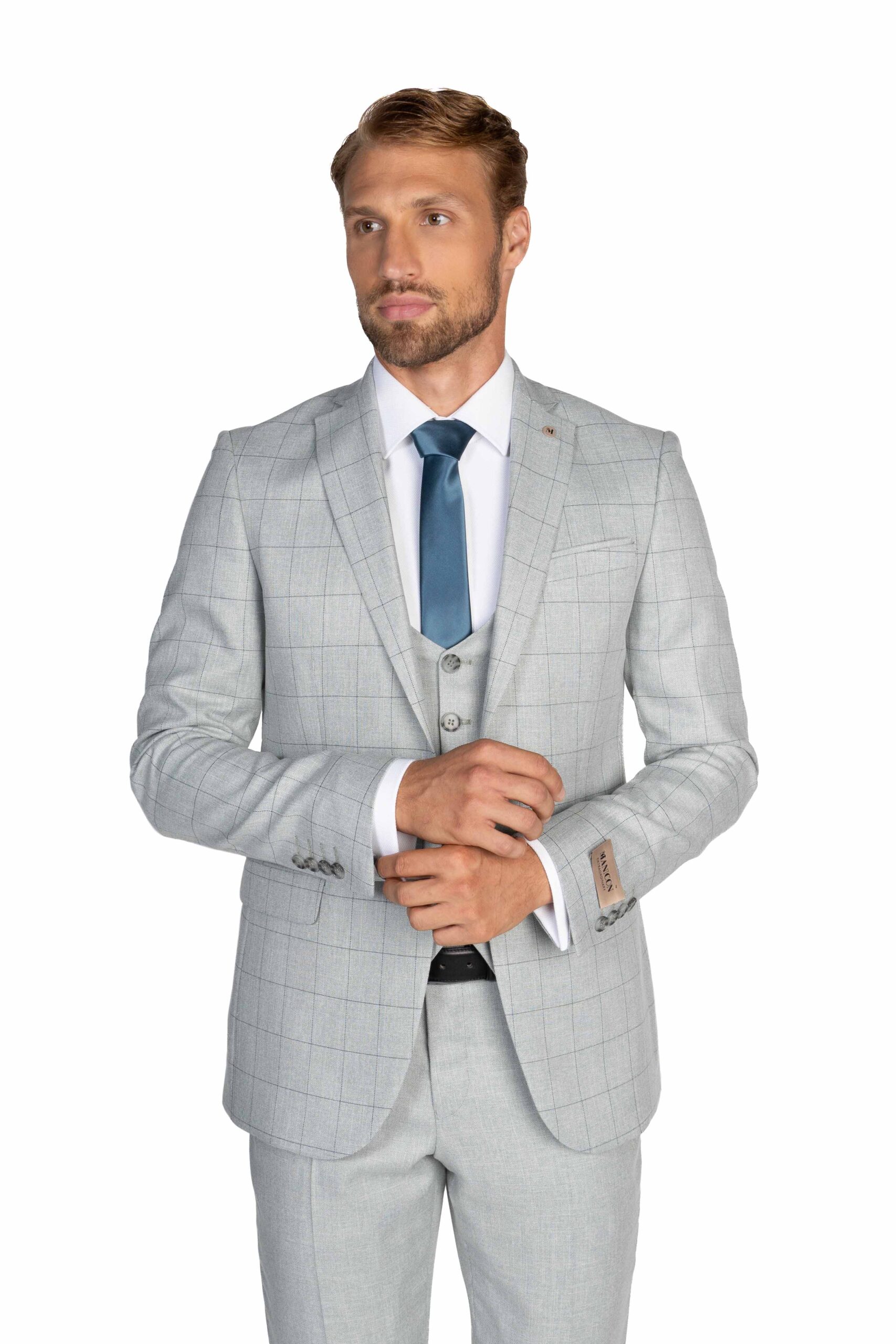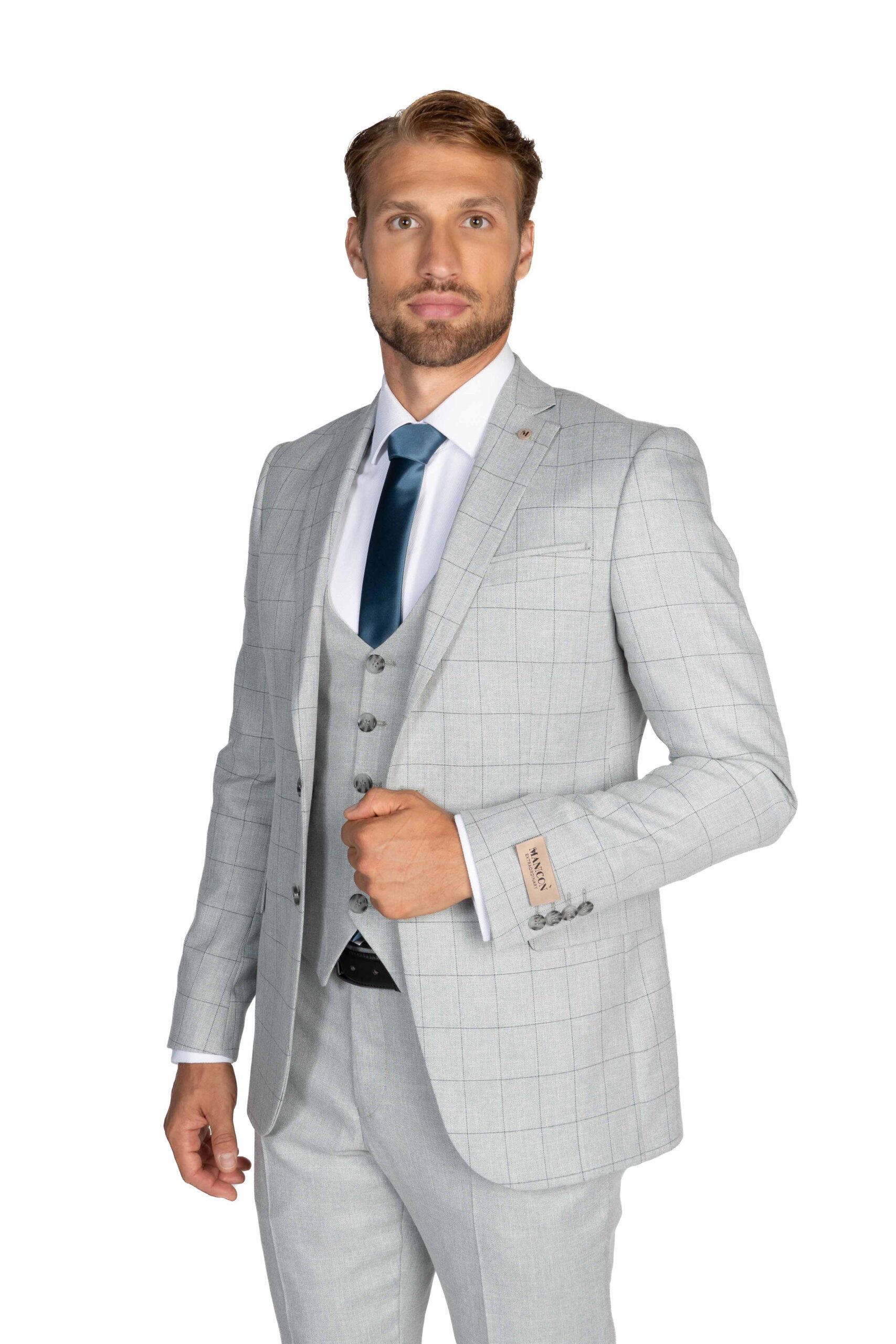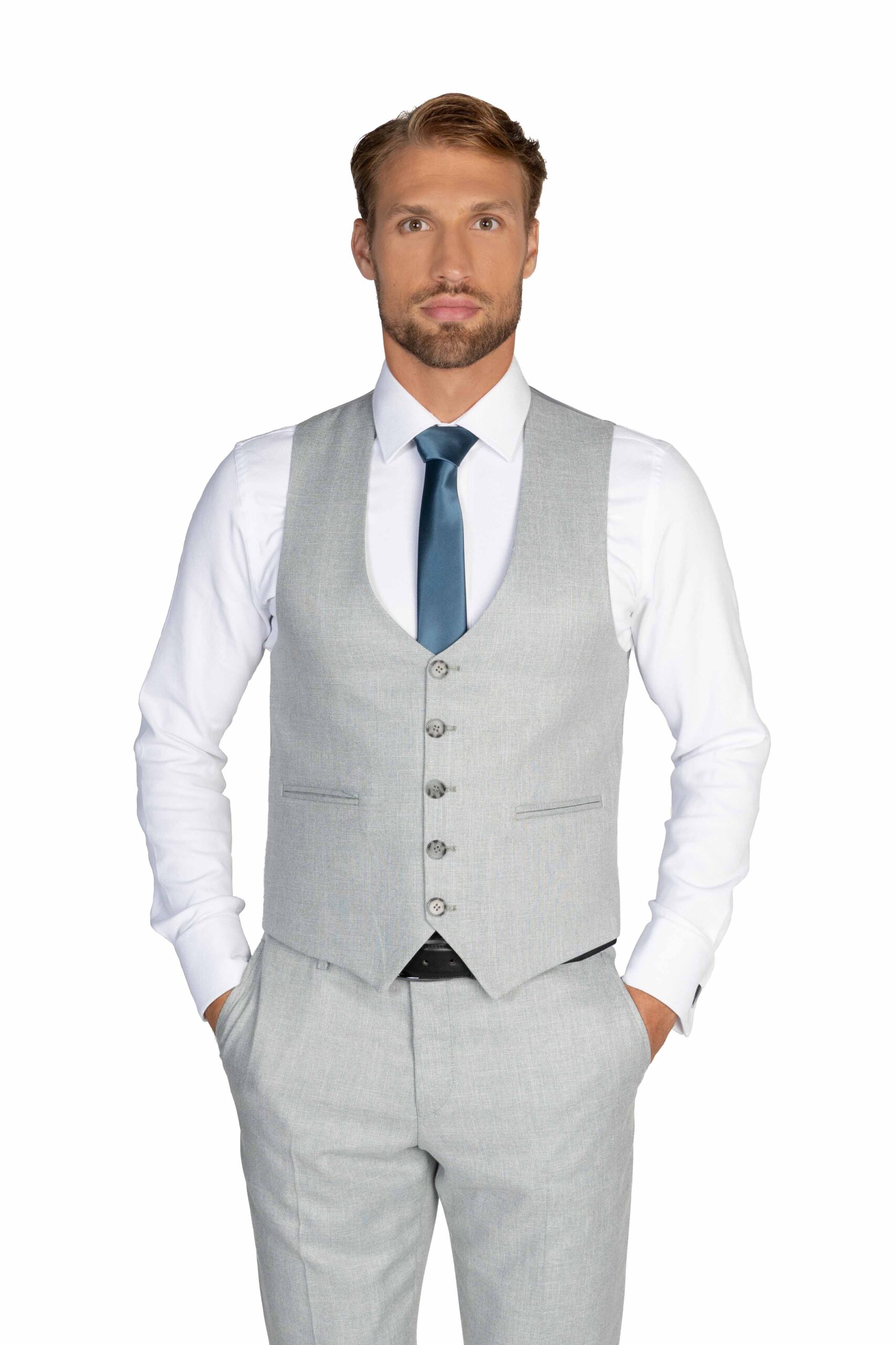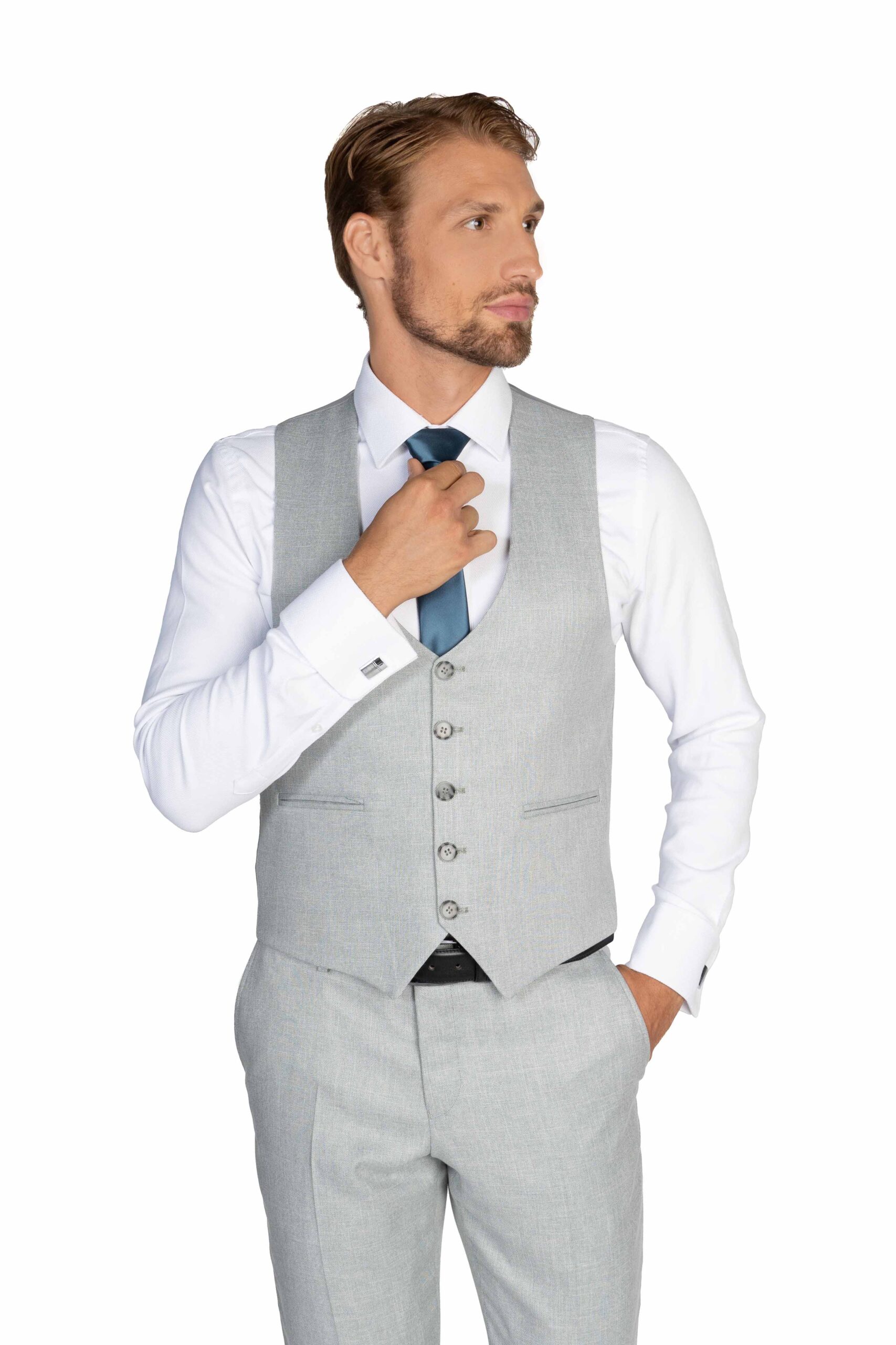 Tento svetlo sivý oblek s čiernym prúžkom je spojením klasickej elegancie s modernou originalitou. Jeho jemný a sofistikovaný dizajn sa podpisuje na každom detaile. Károvaný vzor s jemným čiernym prúžkom na saku dáva tomuto obleku nezameniteľný charakter. Jednoradový strih s dvoma gombíkmi na saku je vkusnou záverečnou bodkou, ktorá zdôrazňuje jedinečnosť. Jednoradová vesta so 4 gombíkmi dodáva outfitu sofistikovaný nádych. Nohavice sú z rovnakej farby hladkej sivej látky ako vesta, čím vytvárajú harmóniu v celom vzhľade. Tento oblek je ideálnou voľbou pre mužov, ktorí nechcú kompromis medzi eleganciou a originalitou. Jeho jedinečný dizajn a farebná paleta ho robia výnimočným výberom pre rôzne (ne)formálne príležitosti. Je to oblek, ktorý kombinuje klasiku s osobitosťou.