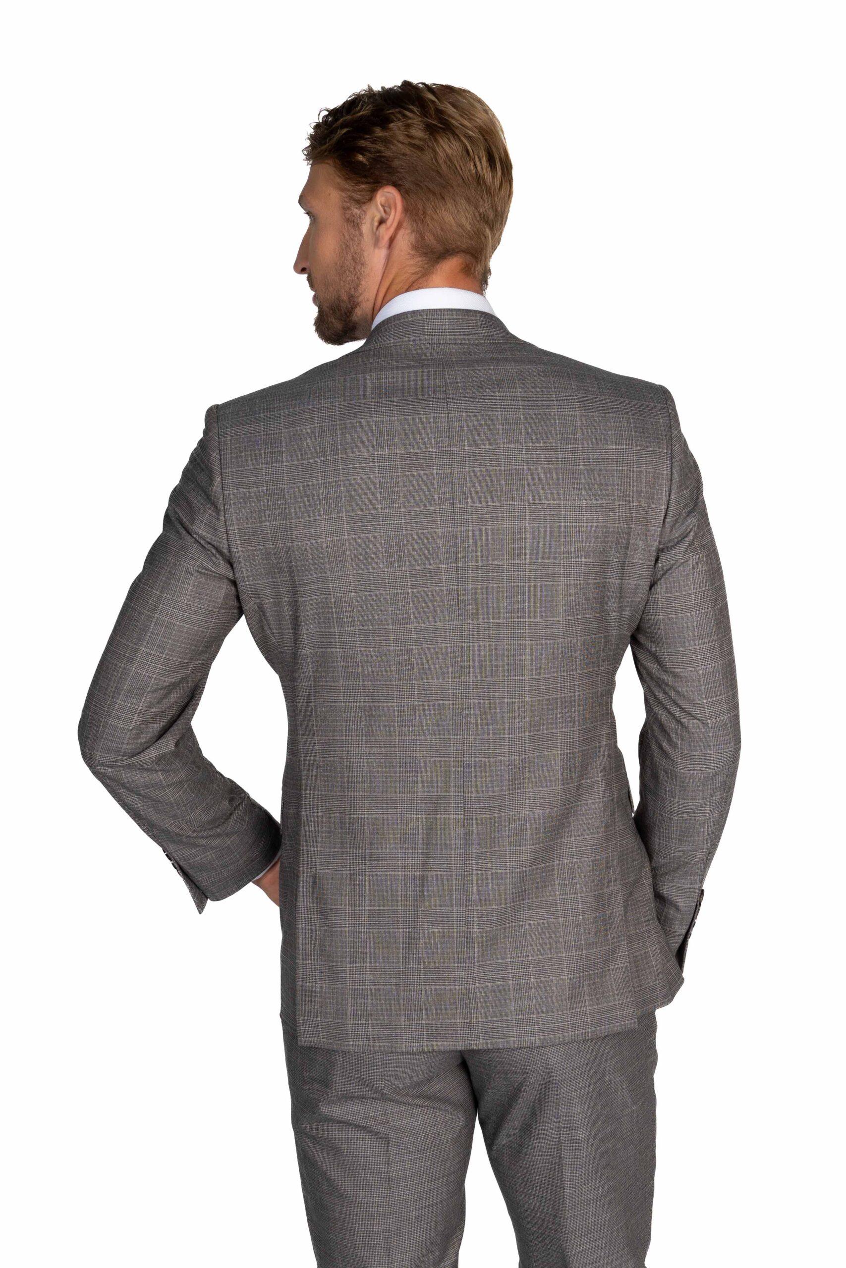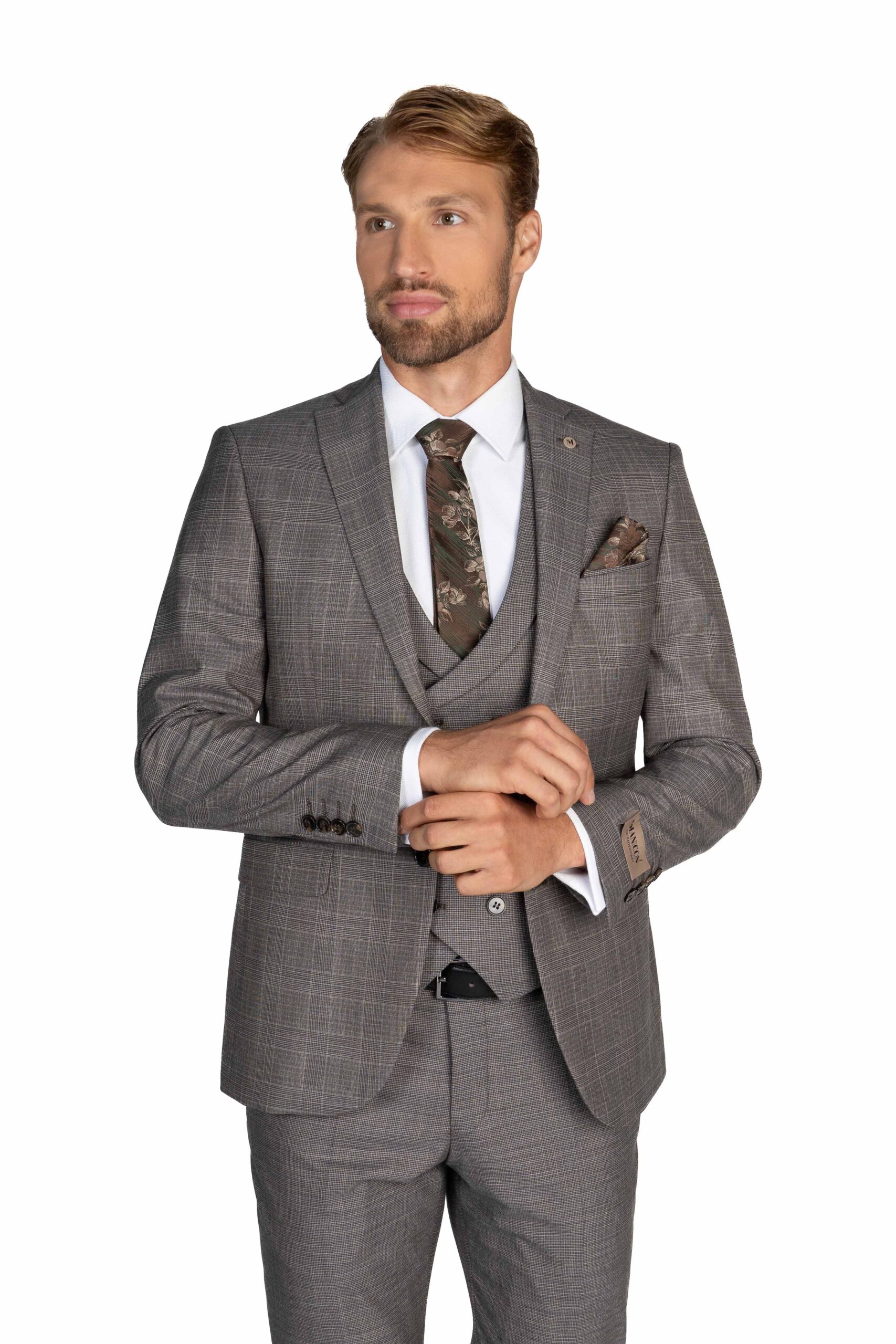 Тmavý sivý oblek s výrazným čiernym károvaním a textúrou - kombinácia elegancie a výrazných detailov. Jeho tmavý sivý odtieň prináša neutrálnu eleganciu, zatiaľ čo výrazné čierne károvanie a textúra tkaniny pridávajú obleku osobitosť a štýl.