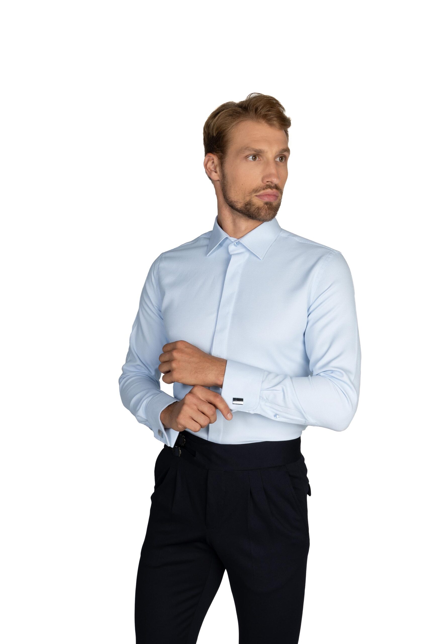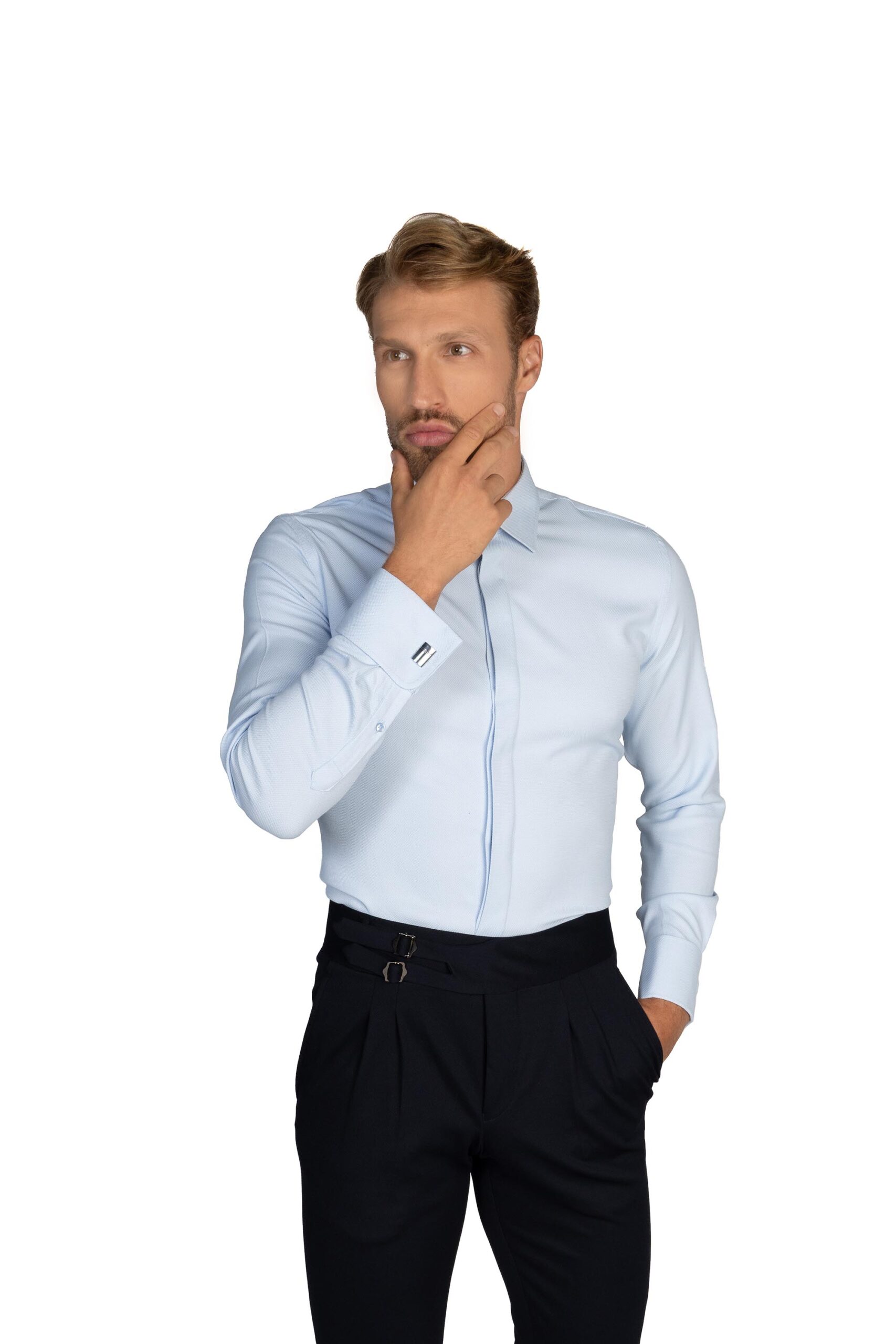 Svetlomodrá jasná nebeská košeľa so štruktúrou na manžetové gombíky je svieži výber do každého obleku. Je to farba, ktorá evokuje pokoj a eleganciu. Táto košeľa pridáva jedinečný nádych štýlu do vášho outfitu. S textúrou a s manžetovými gombíkmi sa stáva nielen praktickým kúskom, ale aj zaujímavým detailom. Je to košeľa, ktorá vám umožňuje vyniknúť bez toho, aby ste sa stali výraznými. Je pre tých, ktorí hľadajú vkusné detaily a kvalitu v jednom.